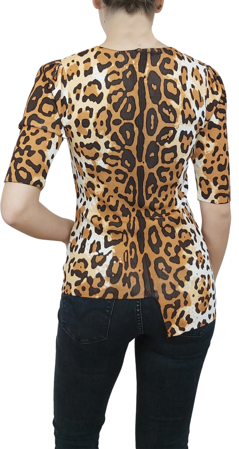 Polera tejida manga 3/4 y semi aglobadas en sisa. Con ruedo asimétrico, cuello redondo y estampado Animal Print.