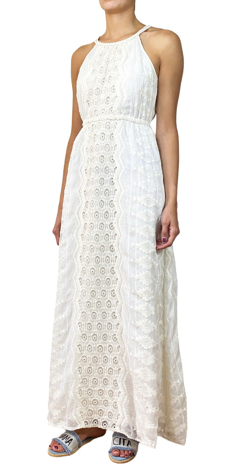 Vestido Blanco con bordados y encajes sin mangas y pabilos tipo cordón.