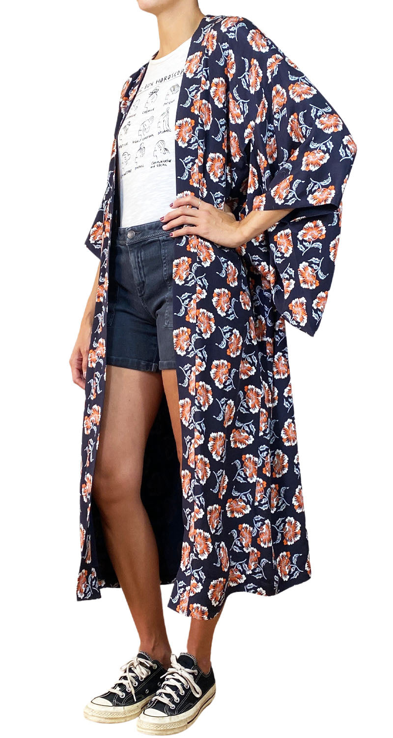 Kimono Azul con flores en Naranjo y detalle en mangas.