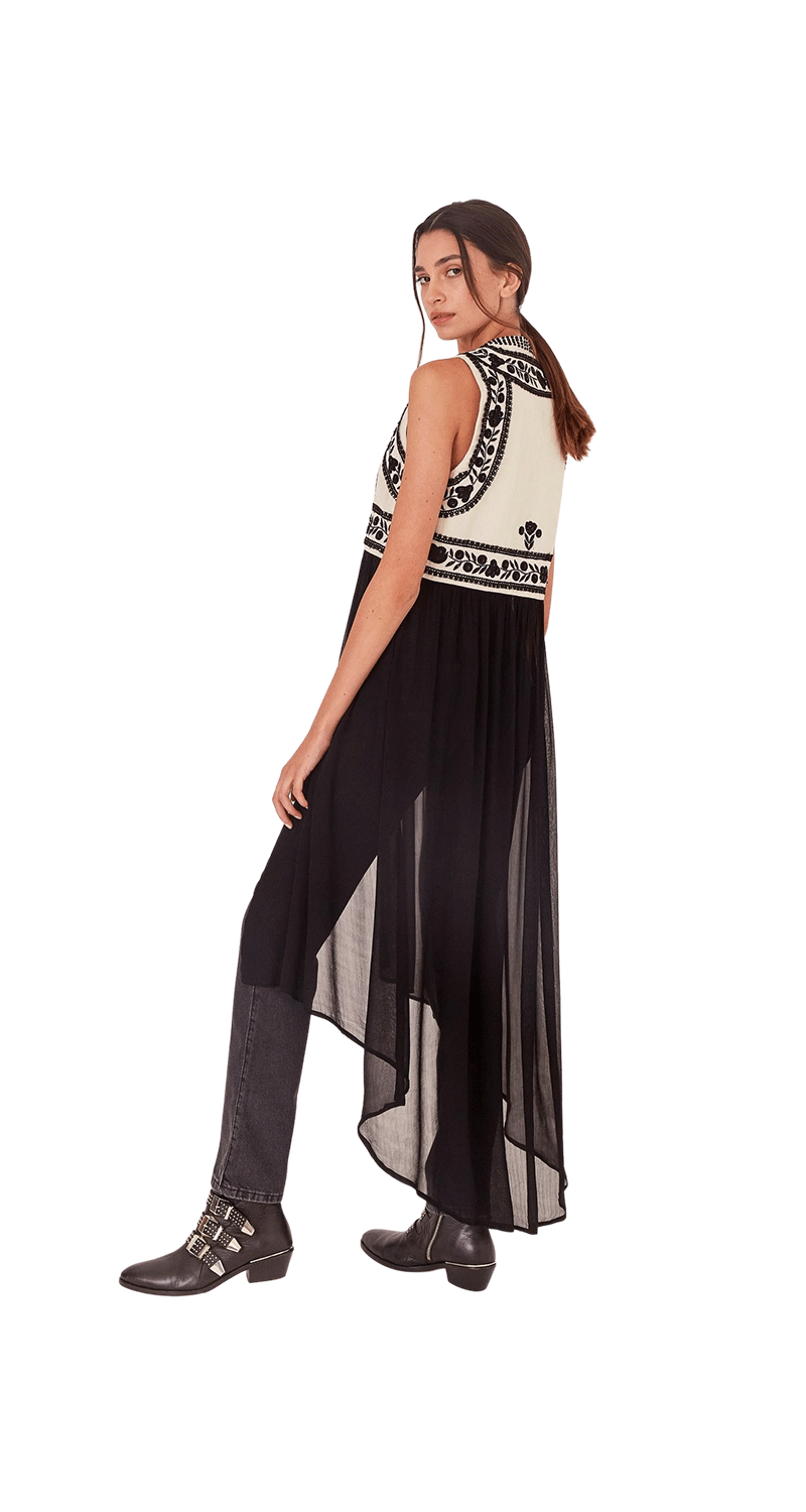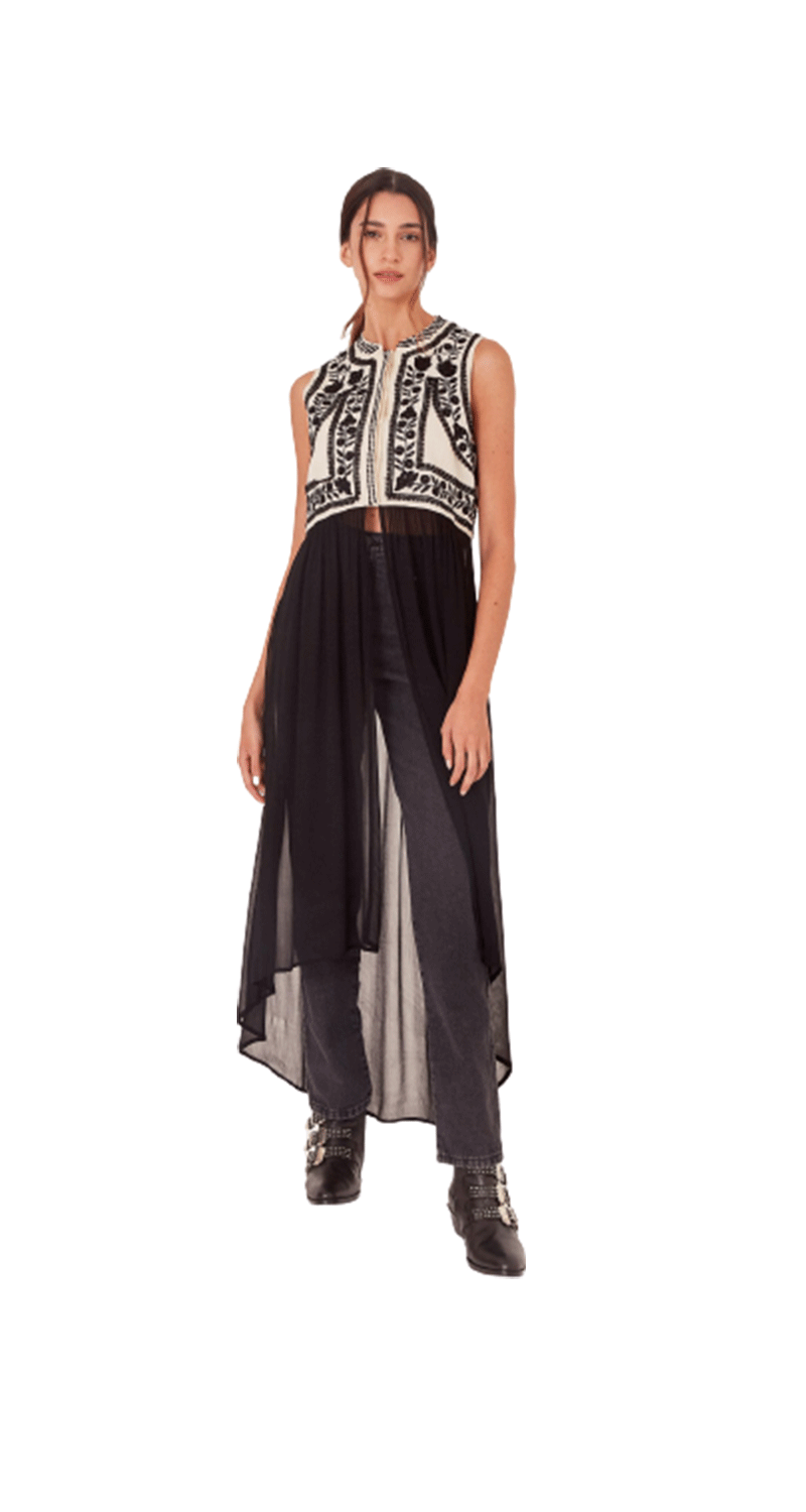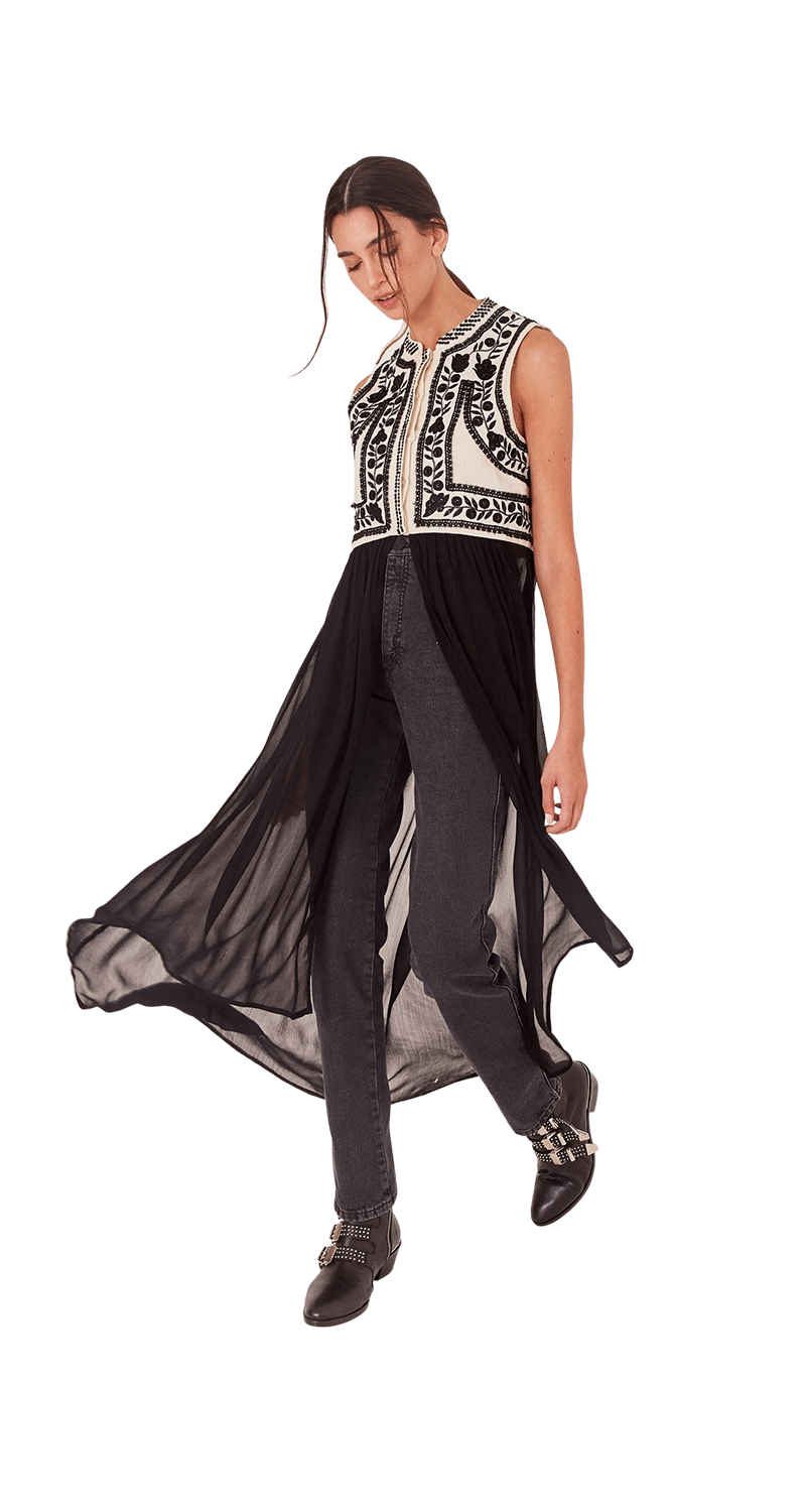 Kimono color Crema y Negro con detalles bordados, bisutería cosidas a mano. Parte inferior de viscosa plisada traslúcida en color Negro.