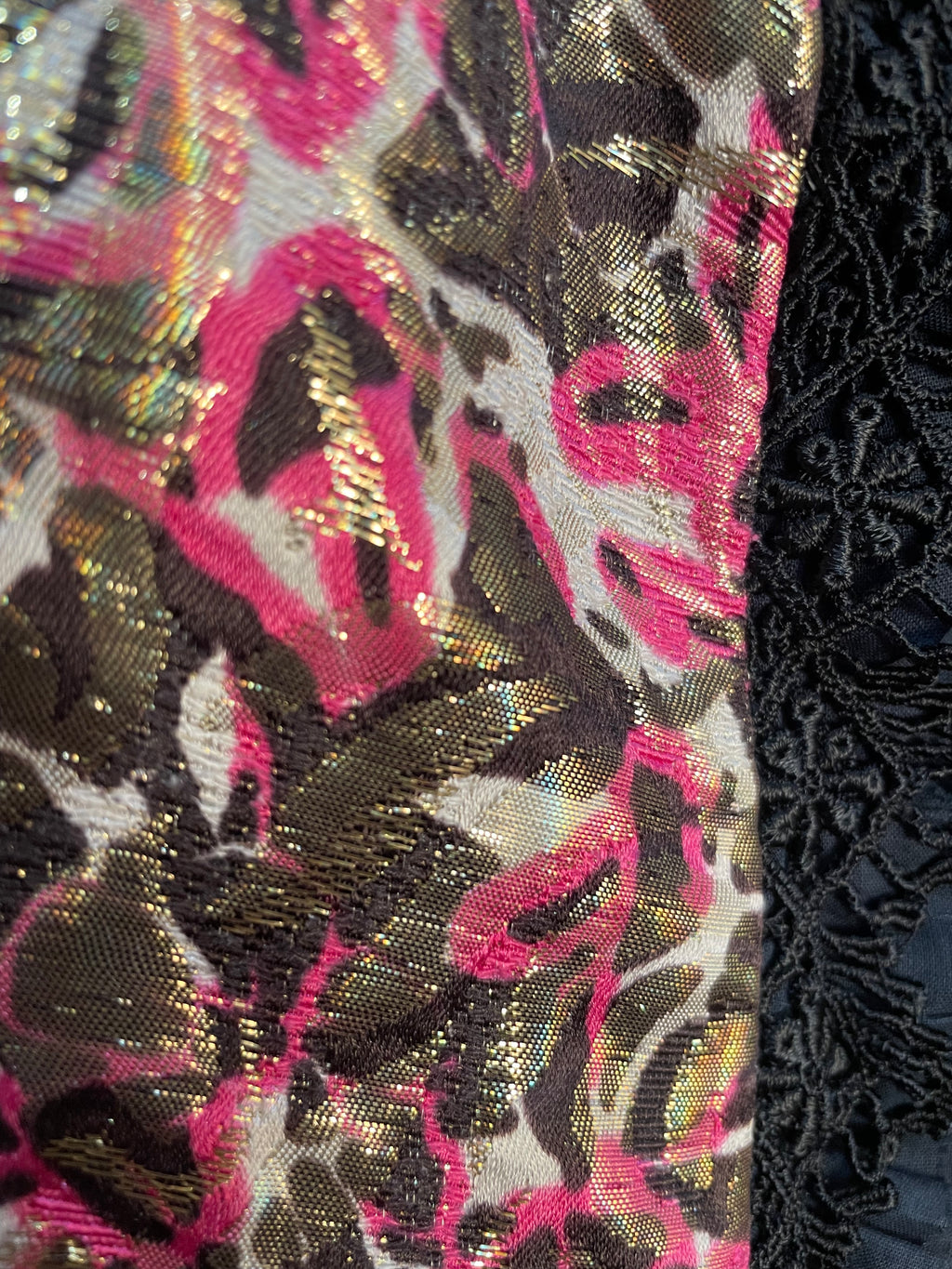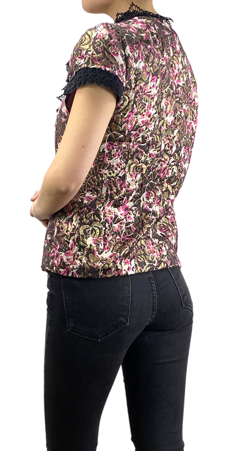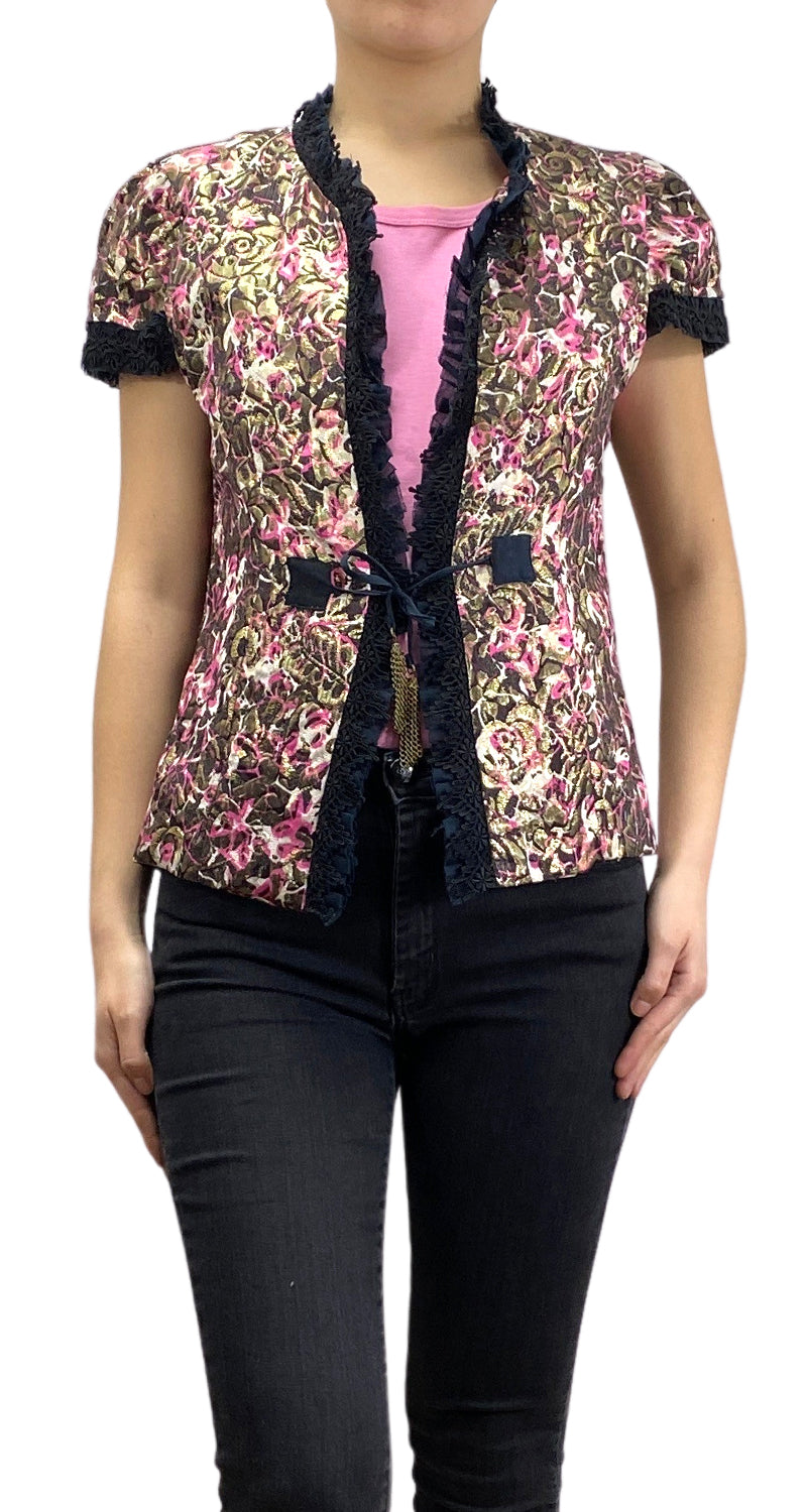 Chaleco con bordado Multicolor, hilos metalizados, bordes con encaje Negro, lazo con pompones de cadenas en delantero.