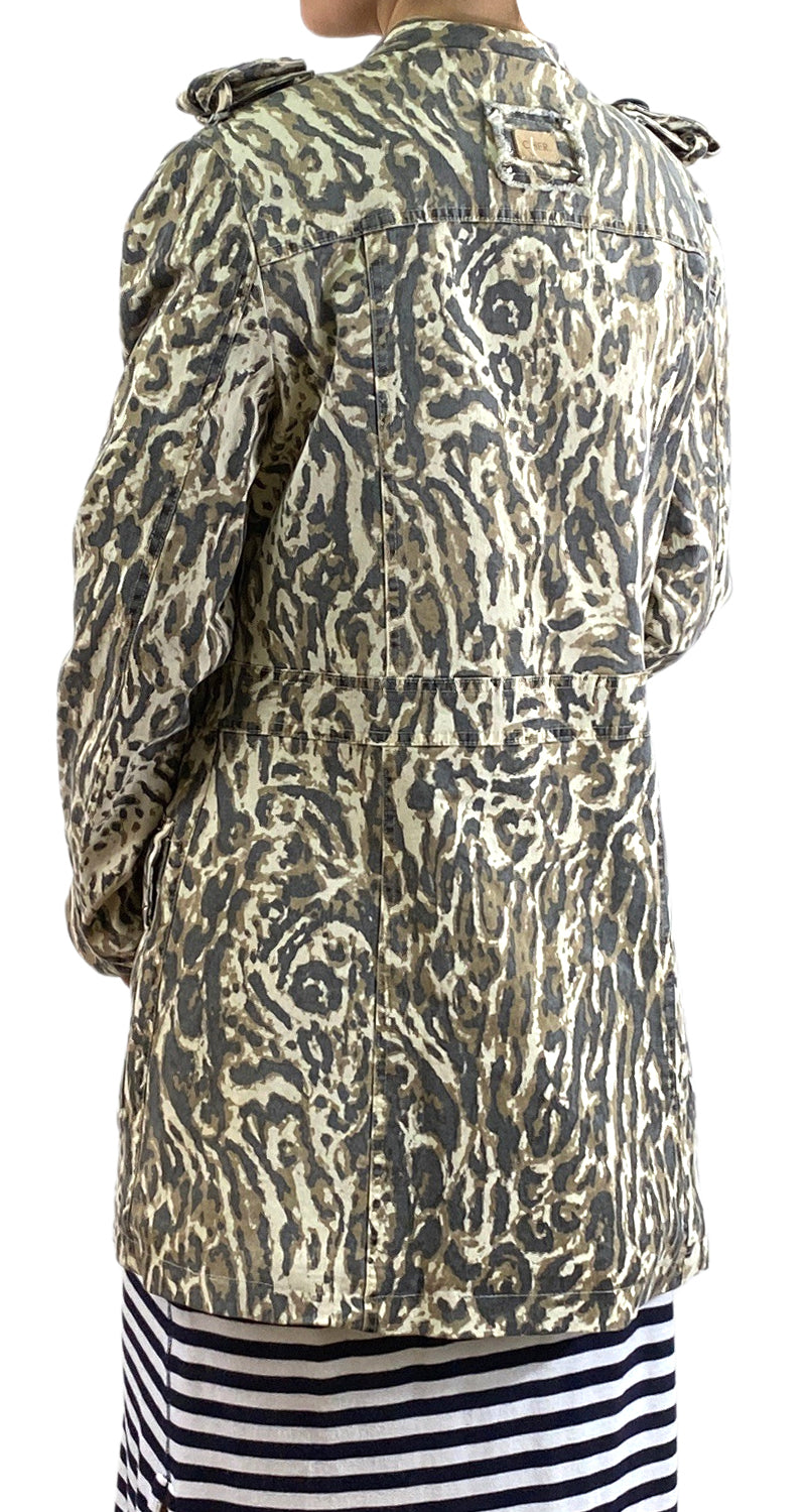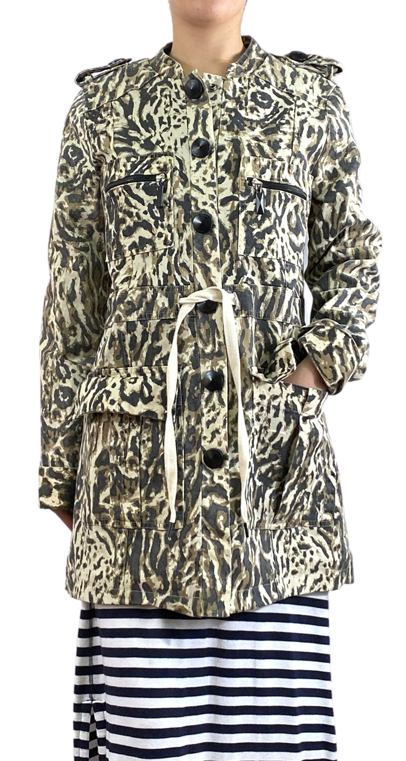 Chaqueta con estampado Animal Print, grandes broches color Negro con letras propias de la marca y cintura ajustable. Talla 2 de la marca.