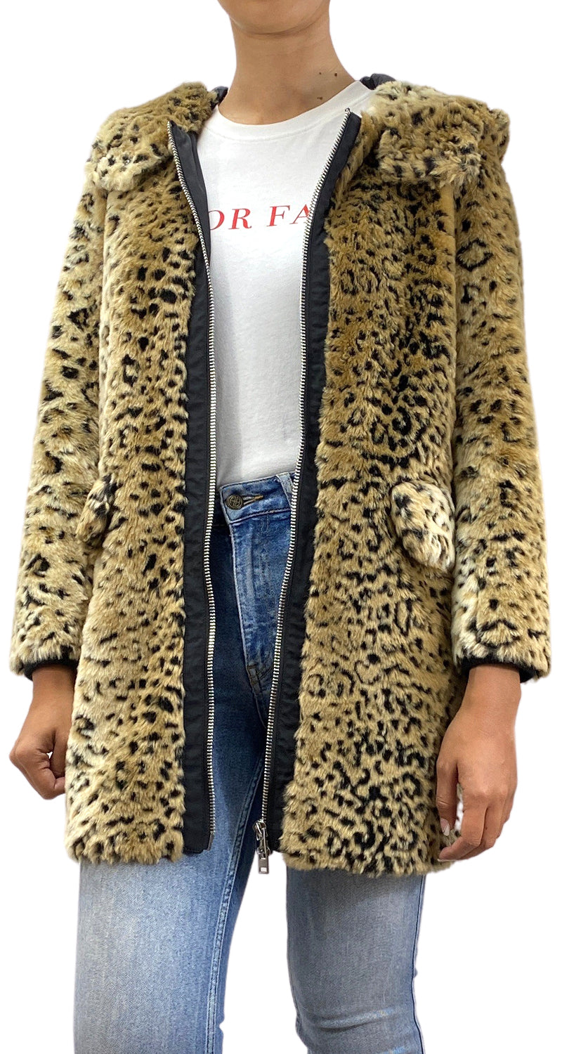 Chaqueta de piel sintética con capucha, dos bolsillos y cierre frontal.