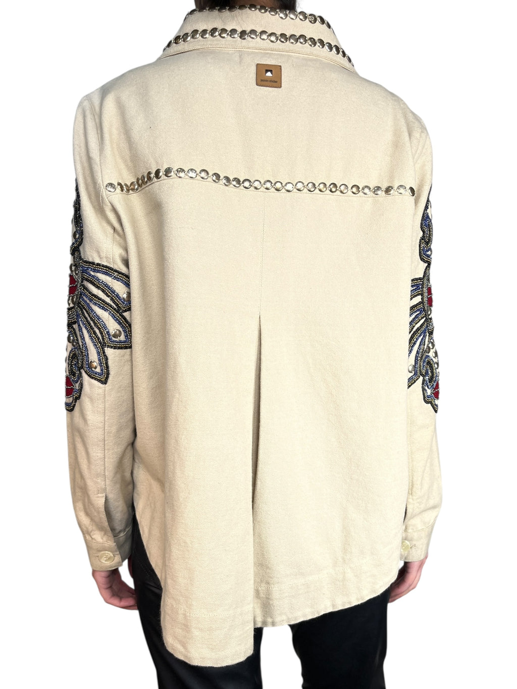 Altura modelo 1,62 cm. Presenta detalle desteñido en hombros y pequeñas manchas. Talla 38/40 - 1 de la marca.