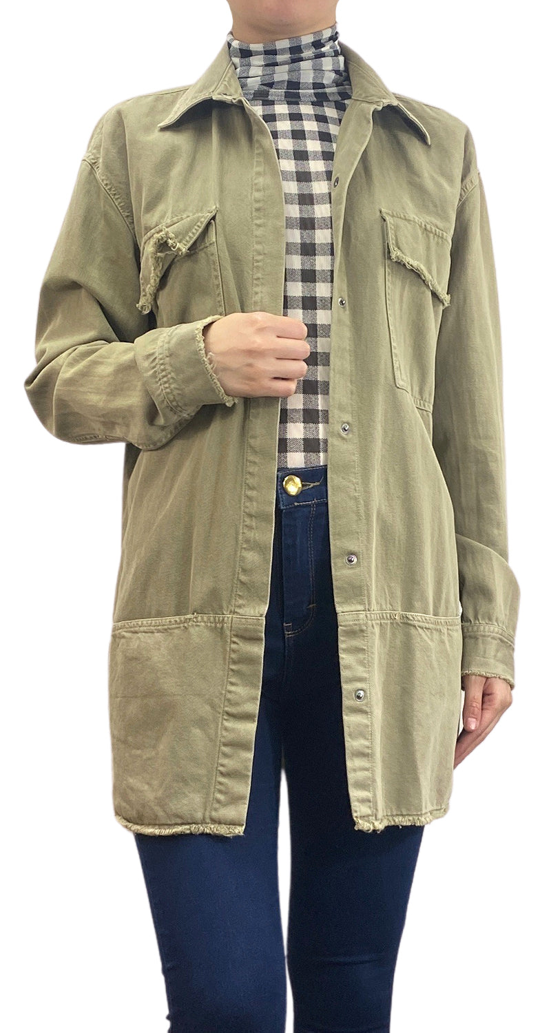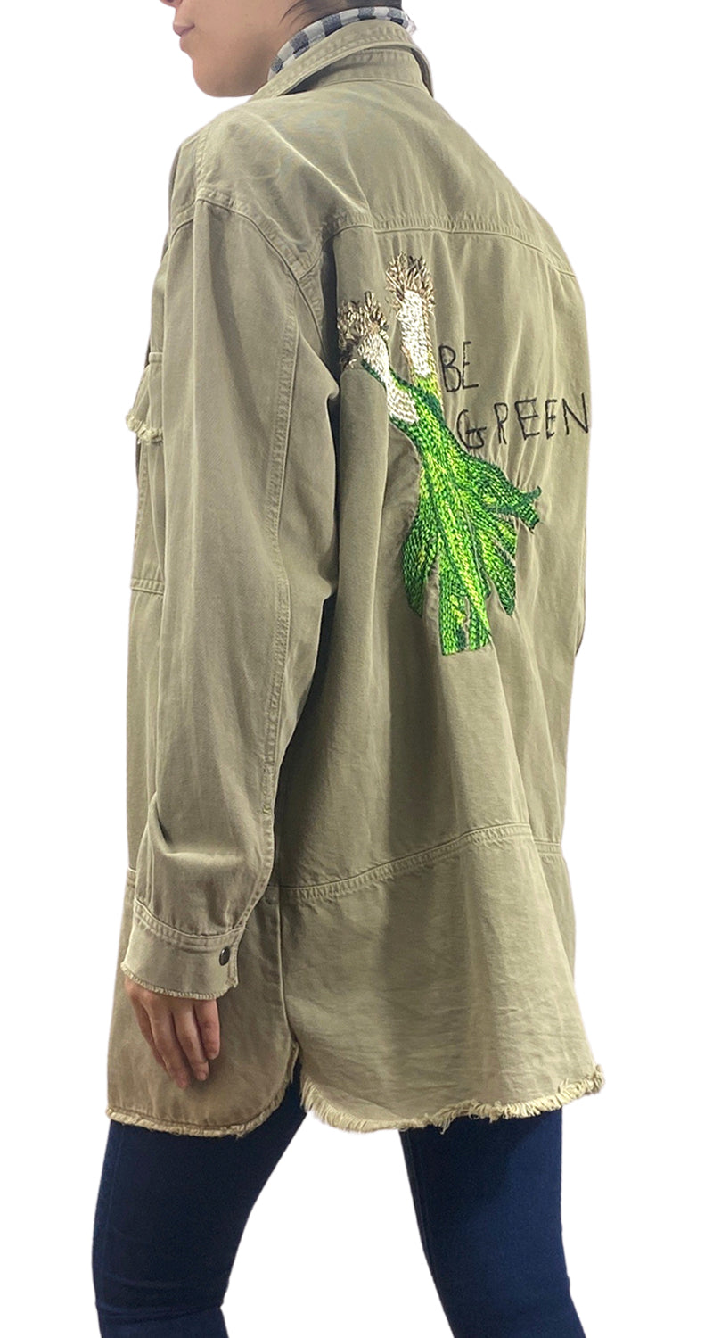 Chaqueta ligera en color Verde, estampado bordado en espalda, 4 bolsillos en delantero, bordes desflecados.