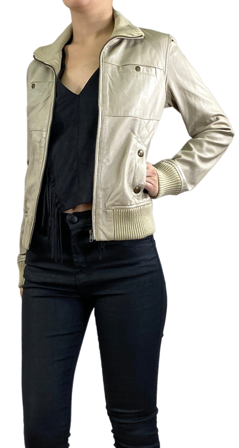 Chaqueta color Beige de Cuero con cierre y 4 bolsillos en exterior.