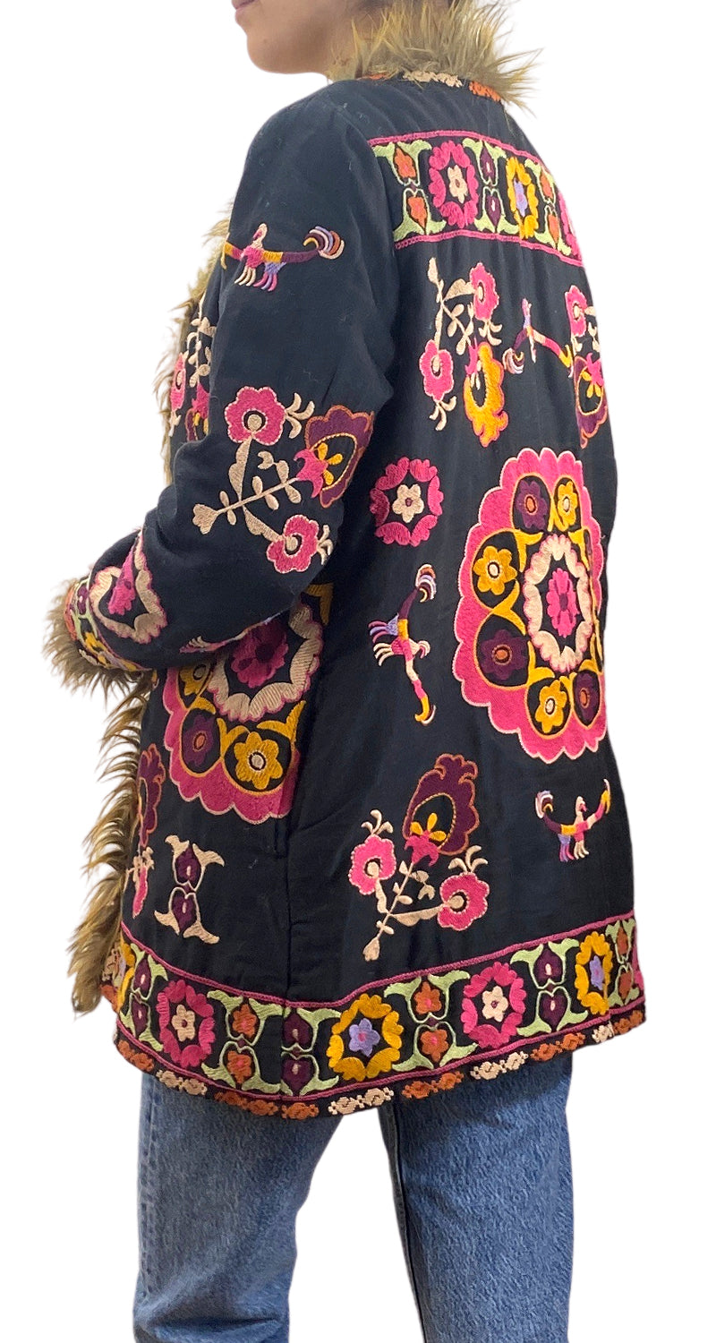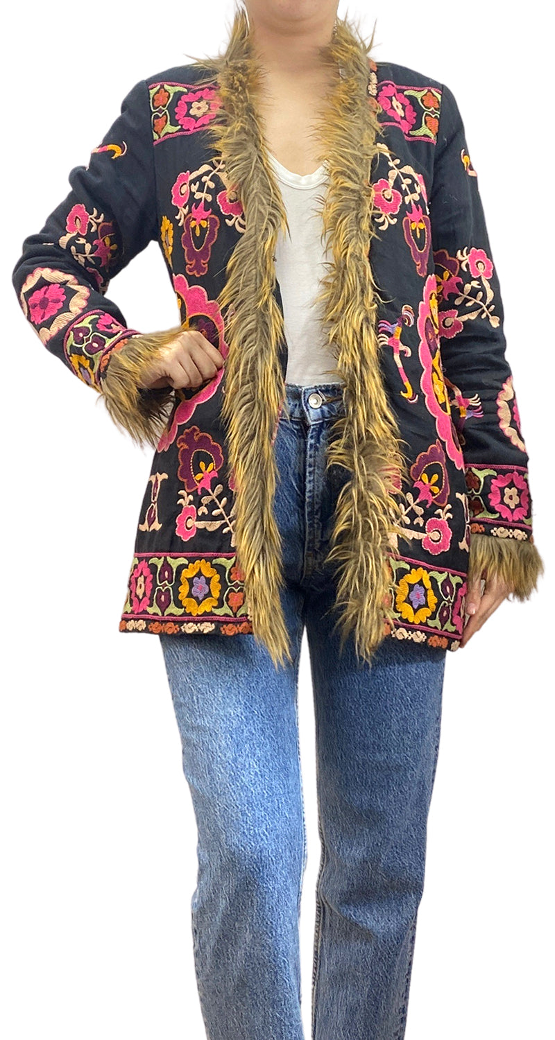 Chaqueta color Negro con bordos multicolor con Piel Sintética. Talla S