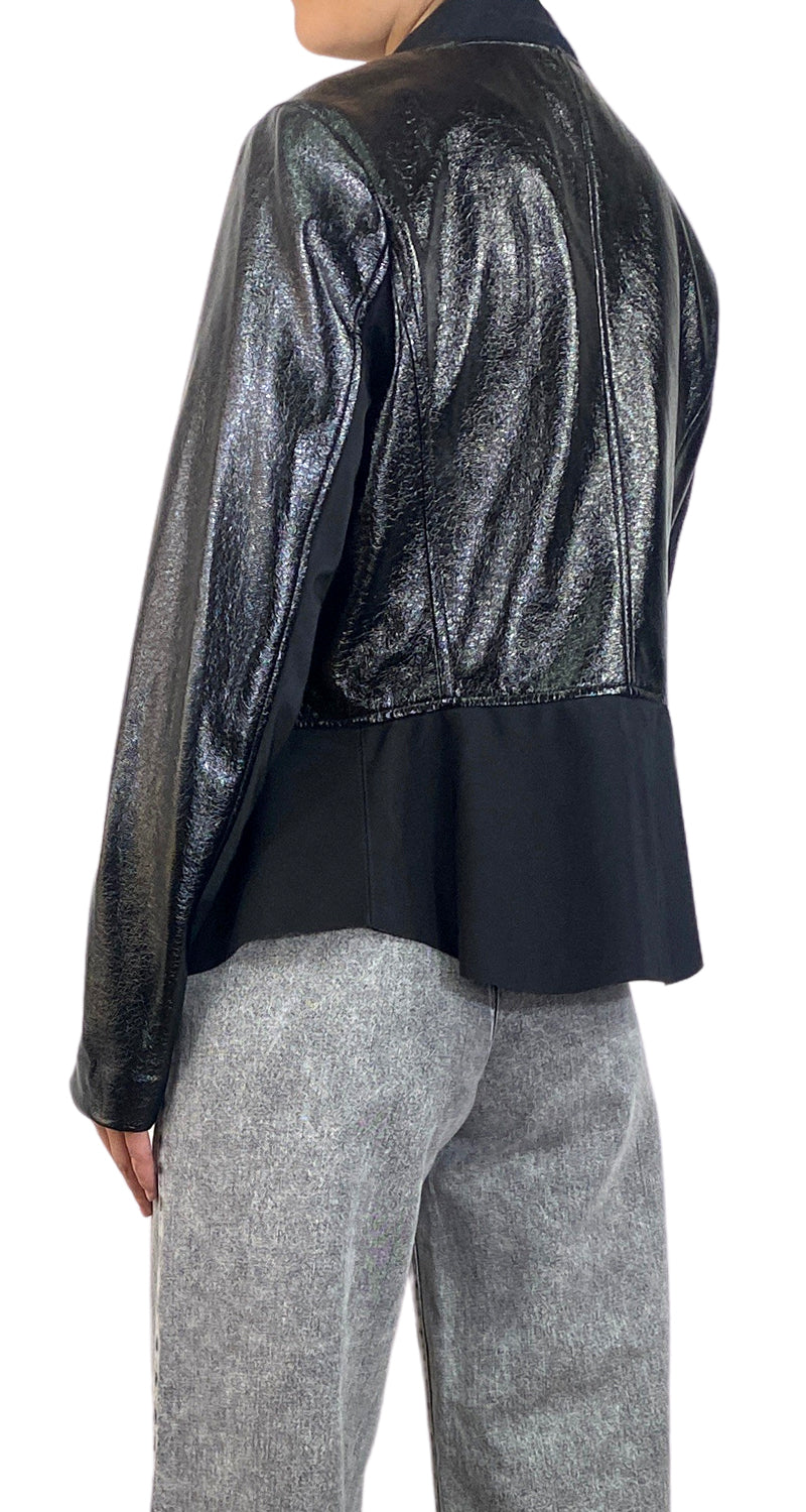 Chaqueta de ecocuero Negro brillante, bolsillos con cierre, broches delanteros, vuelo en tela color Negro en parte inferior, Talla 44/3 de la marca.