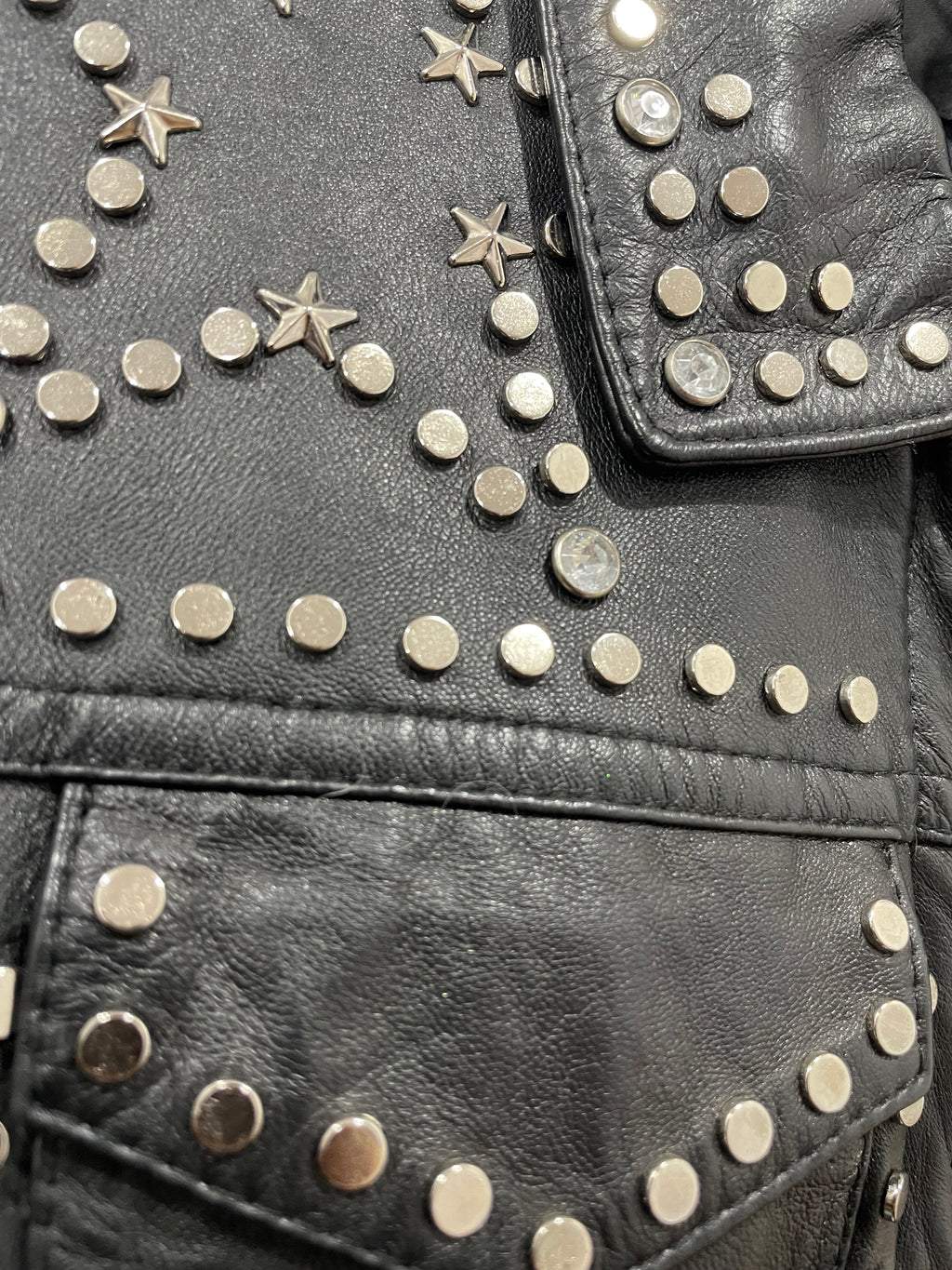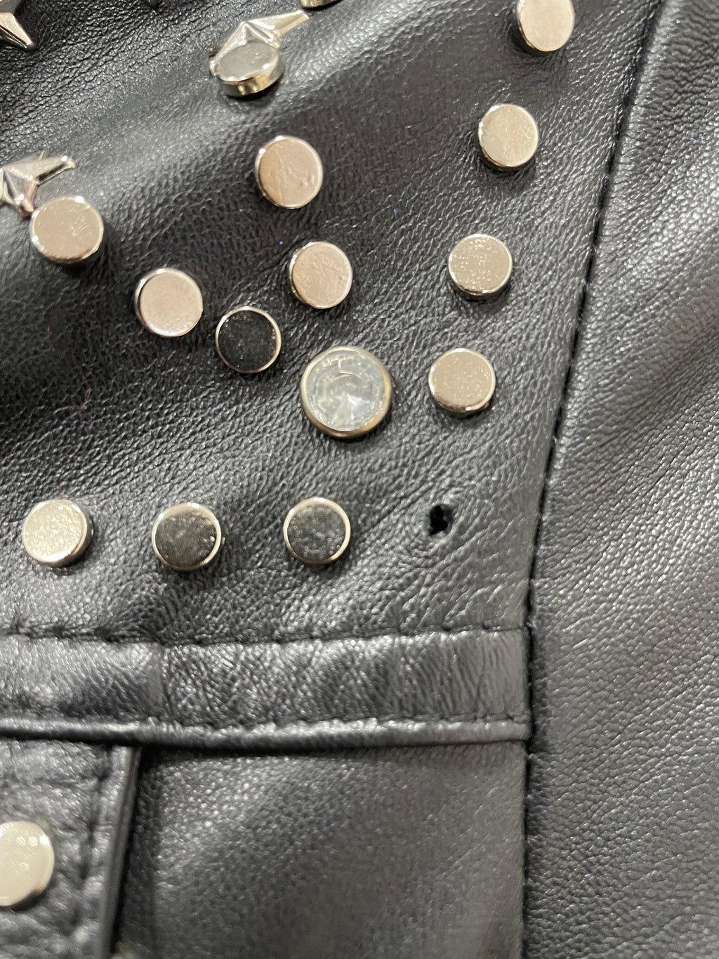 Chaqueta de cuero color Negro con aplicaciones de tallas y brillantes, dos bolsillos y botones frontal. Le falta una tacha en delantero.