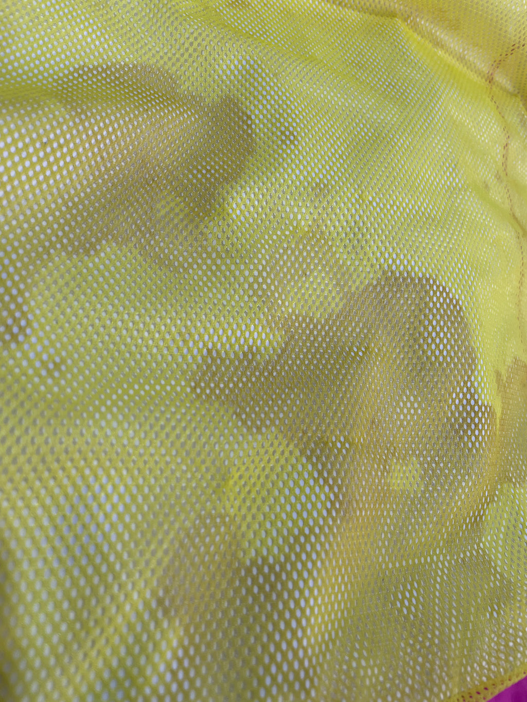 Chaqueta cortaviento con capucha color Fucsia, dos bolsillos laterales, cierre y velcro frontal, forro de malla amarilla al interior con manchas. Talla L de niño de la marca.
