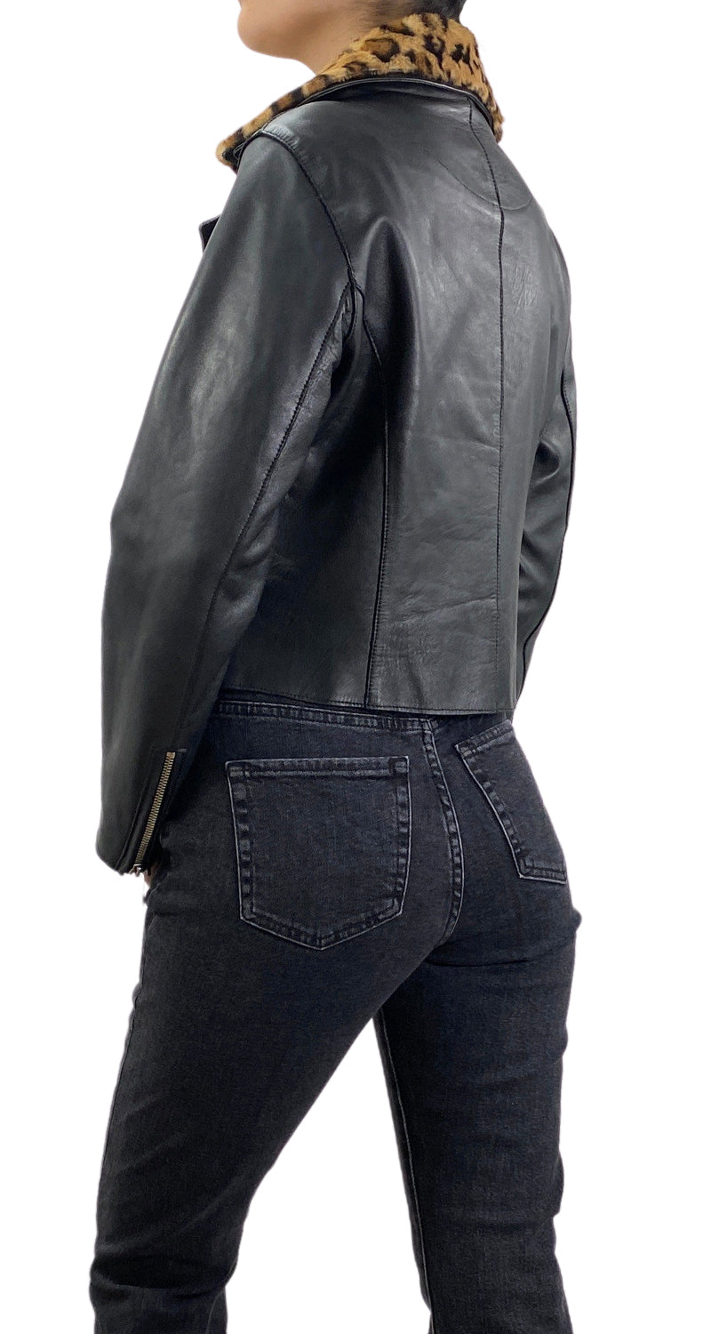 Chaqueta color Negro de cuero estilo biker con aplicación de corazones brillantes y cuello con diseño Animal Print. Talla 2 de la marca.