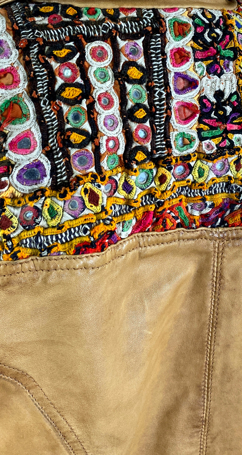 Chaqueta de cuero color Café, 4 bolsillos con cierre en delantero y hombros con diseño bordado y aplicaciones de espejo, presenta elevado signos de uso, Talla 6 de la marca.