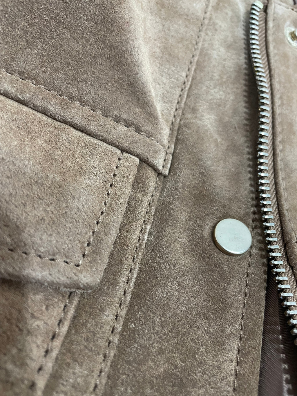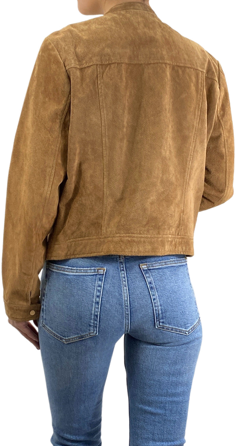 Chaqueta de cuero en color Café con dos bolsillos sobrepuestos con tapas en delantero, cierre y broches a presión Dorado frontal.