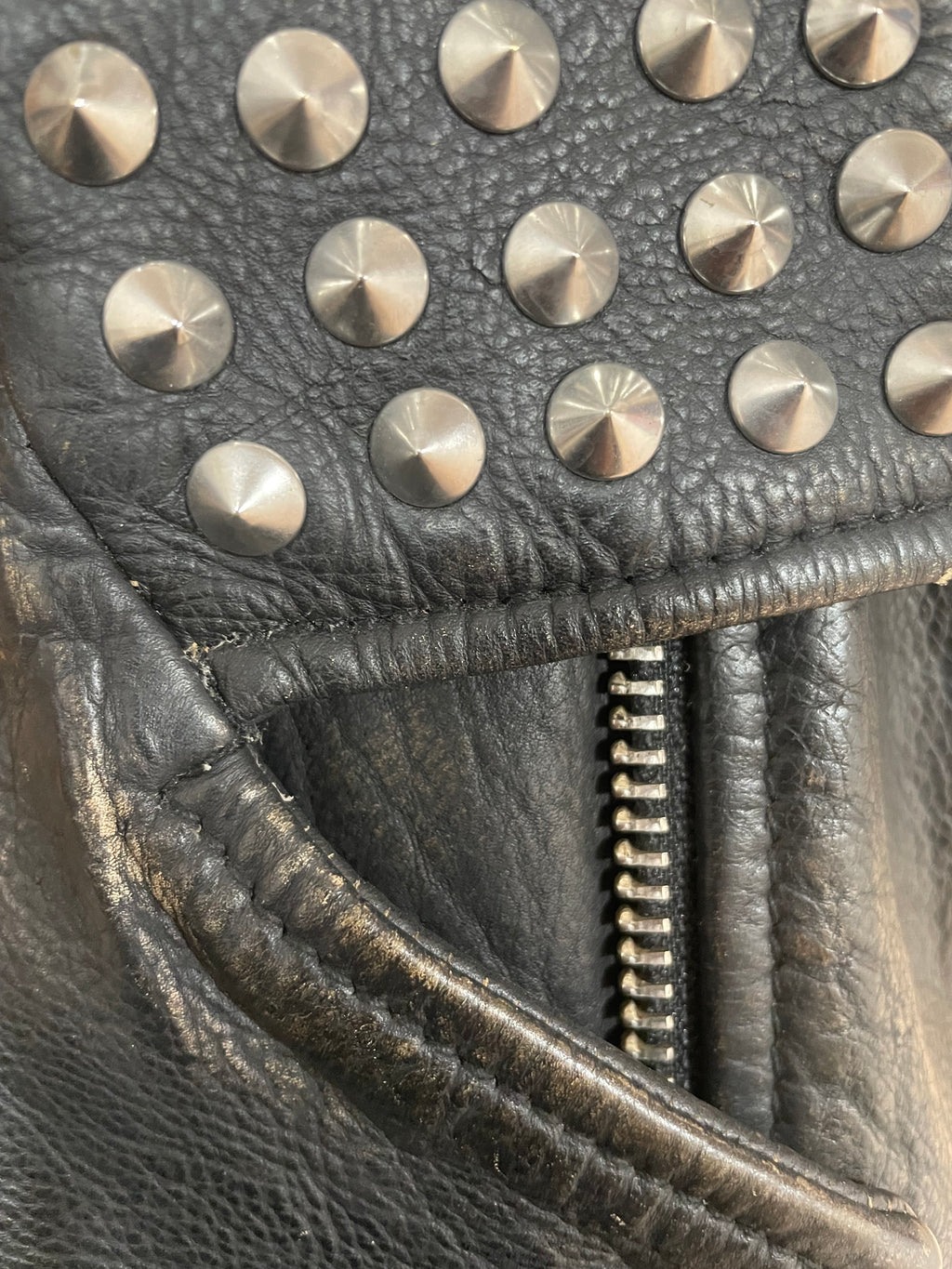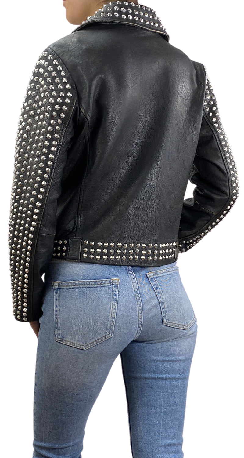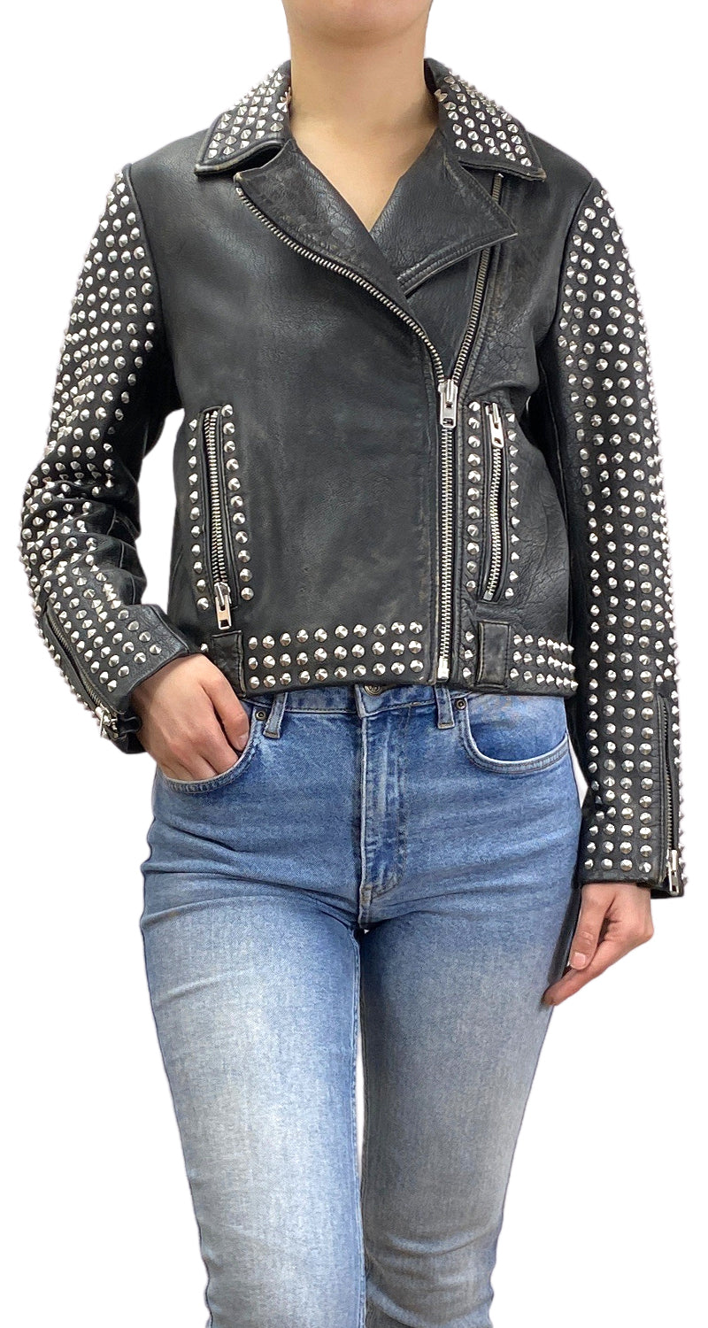 Chaqueta de cuero en color Negro con diseño efecto desgastado, con tachas puntiagudas, dos bolsillos y cierre frontal. Talla 4 US de la marca.