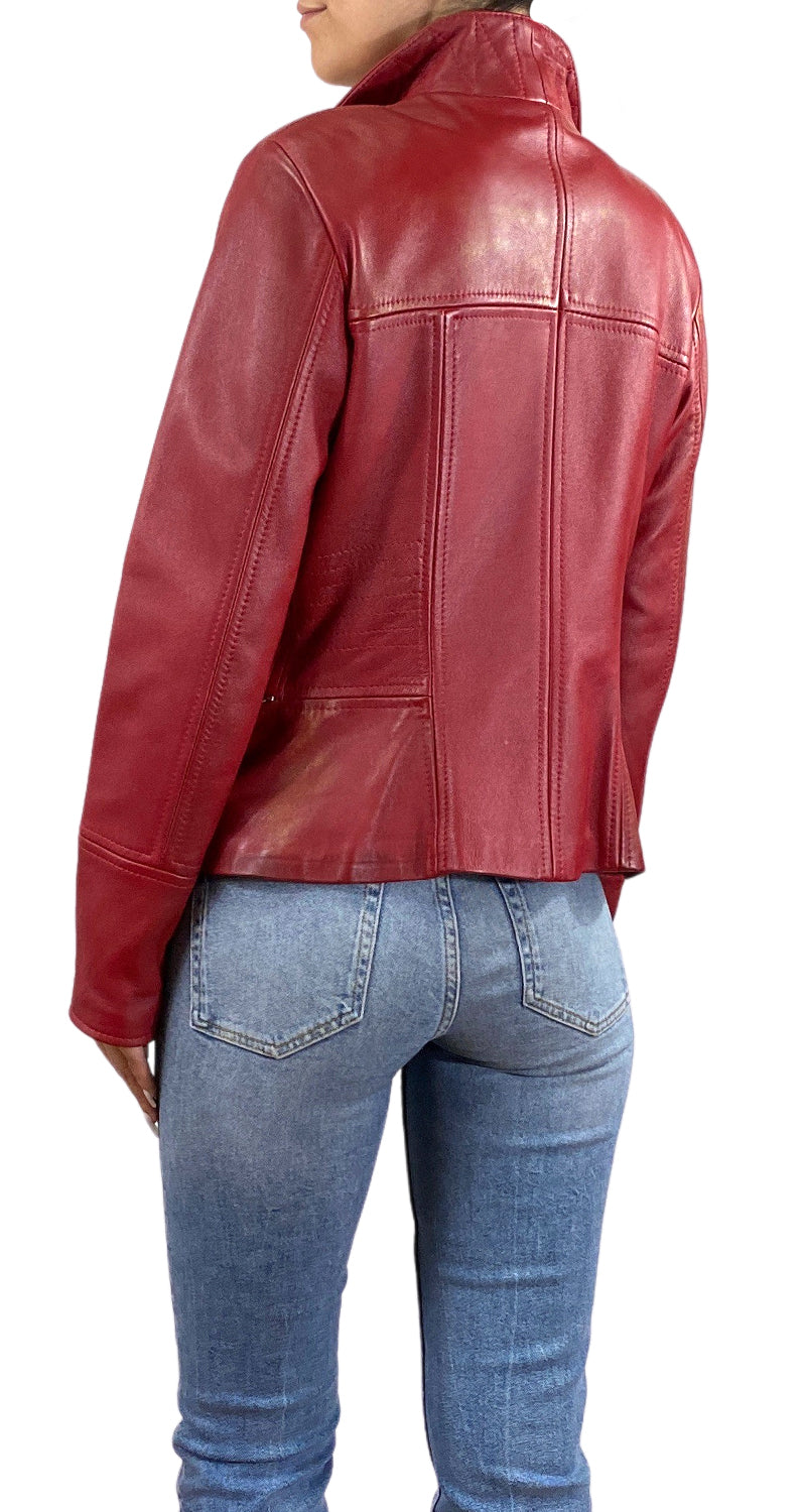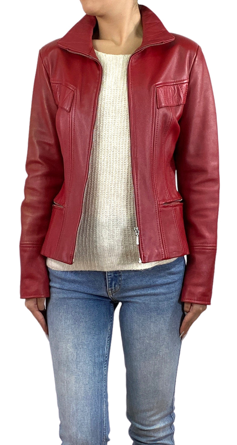 Chaqueta de Cuero color Rojo con cierre metalizado y bolsillos en delantero, talla 38. Marca original Kubicz.