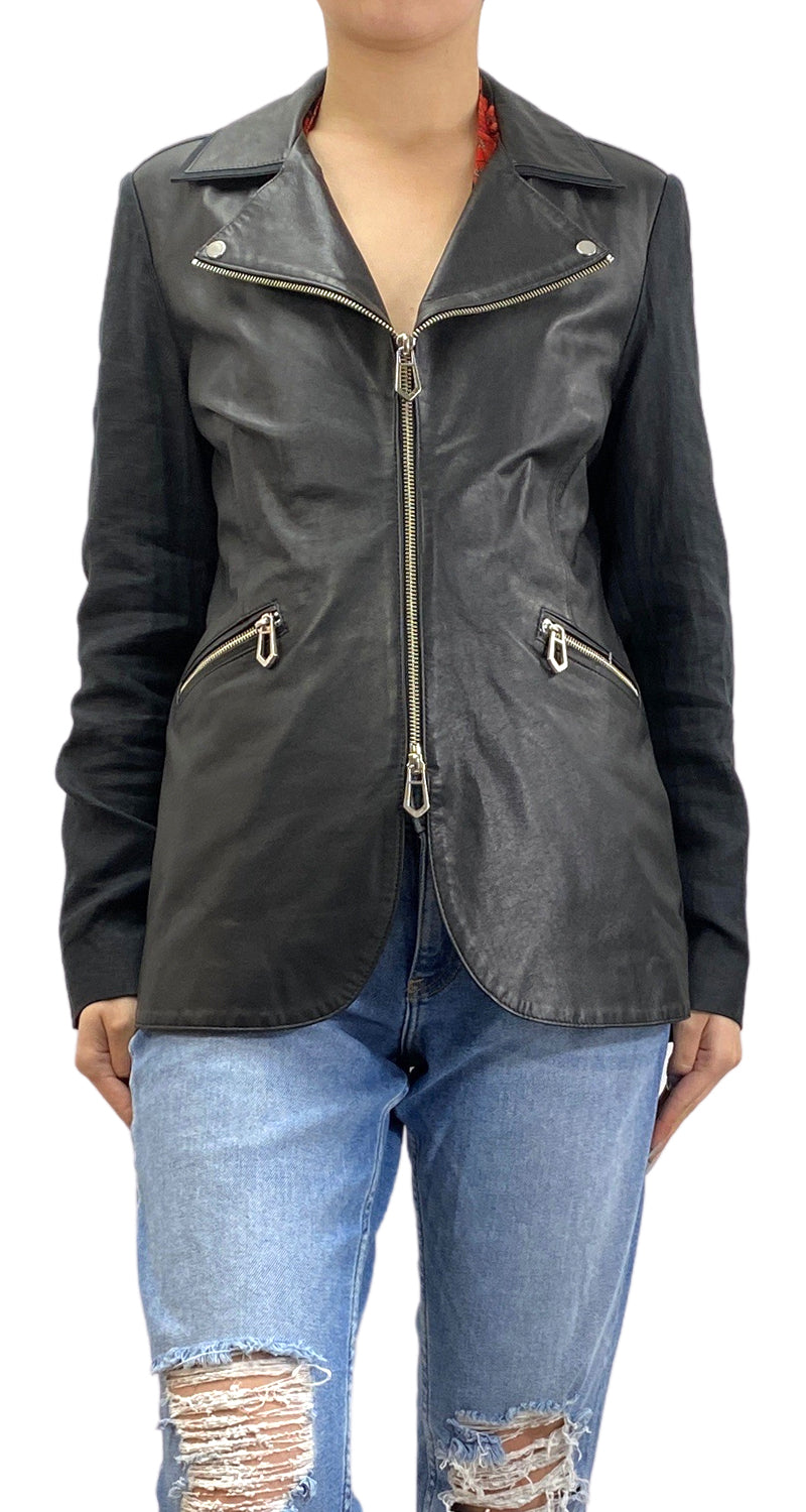 Chaqueta de cuero en delantero, espalda y mangas de Lino en color Negro, dos bolsillos y cierre frontal. Talla 42/2 de la marca.