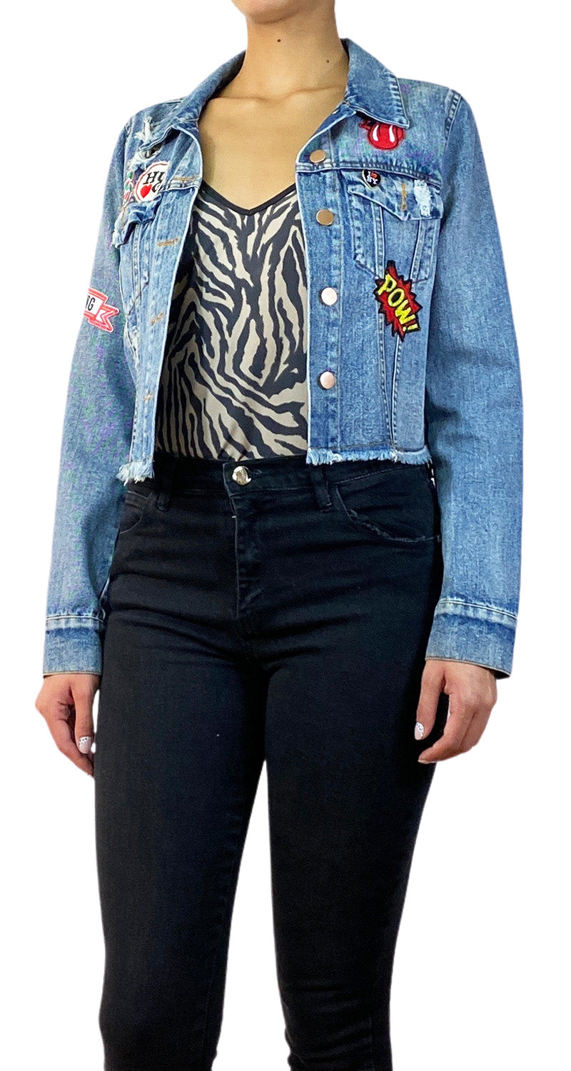 Chaqueta Denim color Azul con parches y dos bolsillos en delantero, detalles desflecado, pin de corazón en bolsillo.