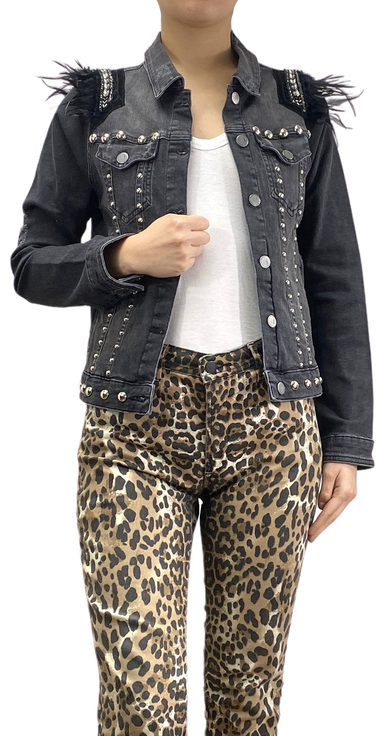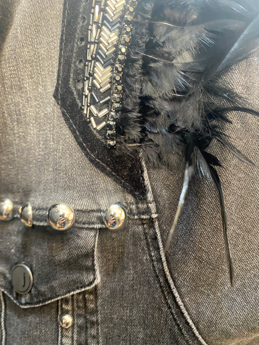 Chaqueta Denim color Negro con aplicación de tachas, mostacillas y plumas. Talla 1 de la marca.