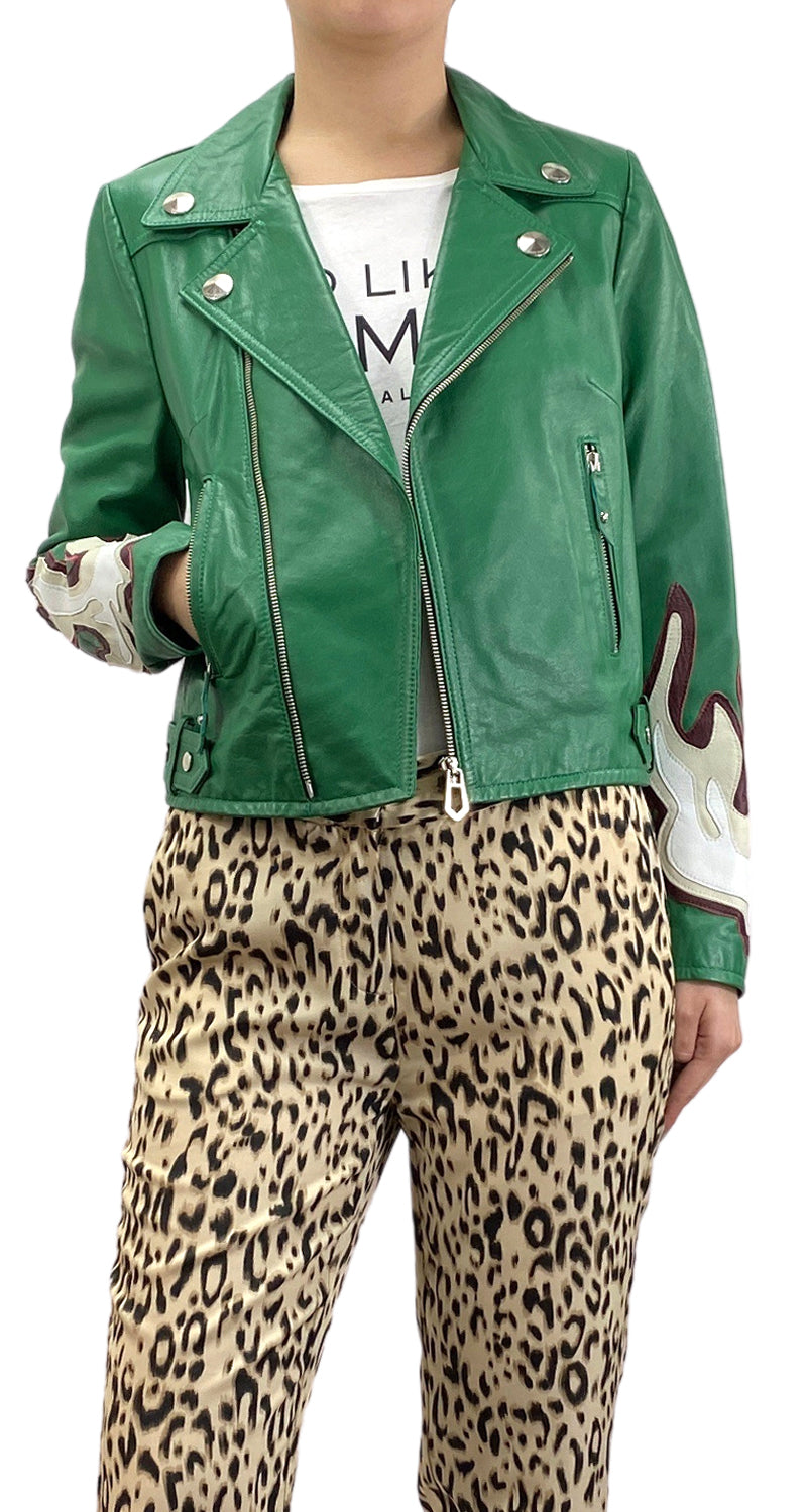 Chaqueta de cuero en color Verde con diseño en espalda de dragón y mangas con fuego, dos bolsillos y cierre frontal. Talla 1 de la marca.
