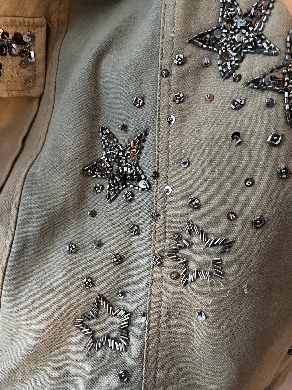 Presenta ausencia de mostacillas y lentejuelas en espalda.