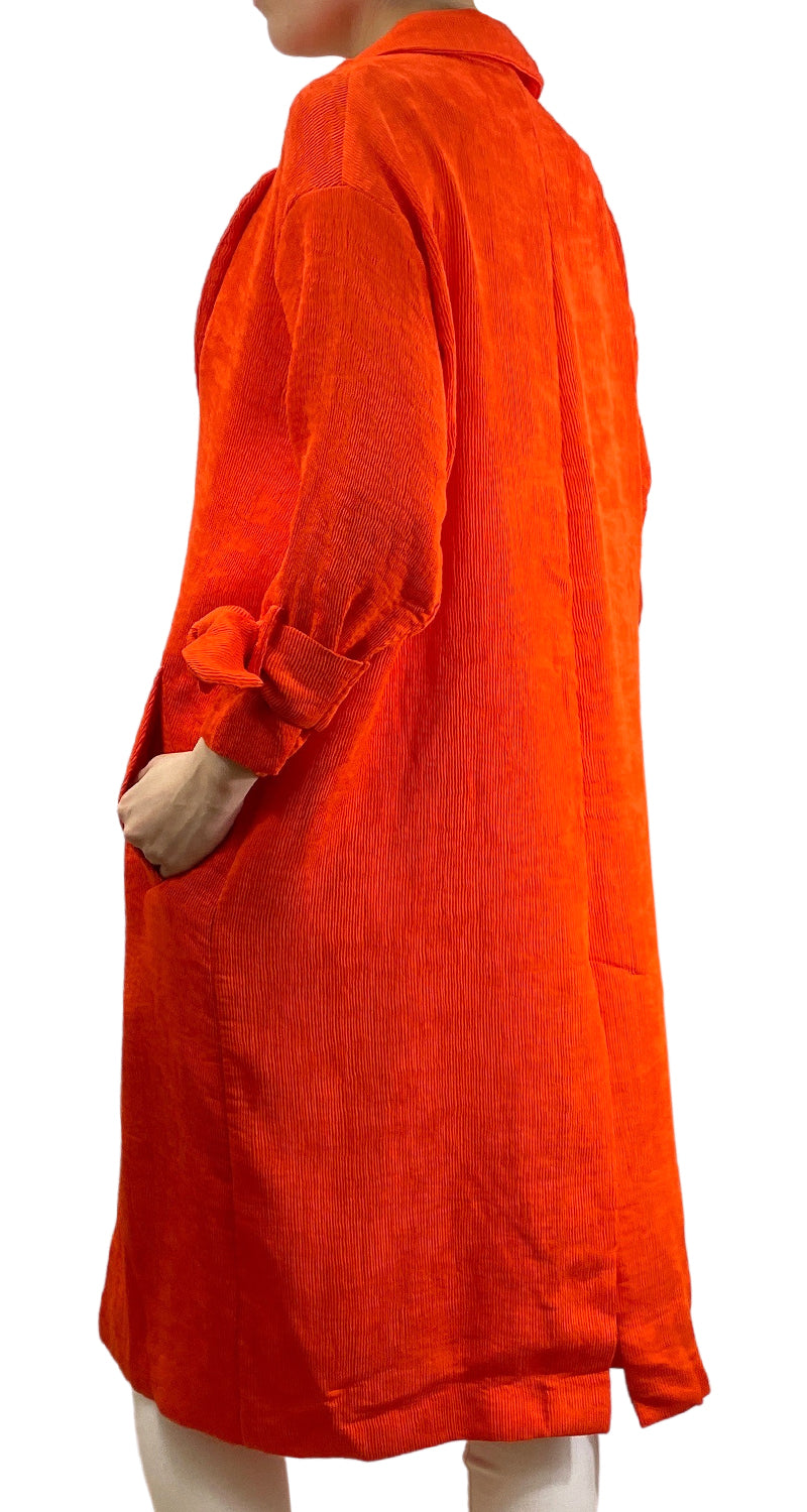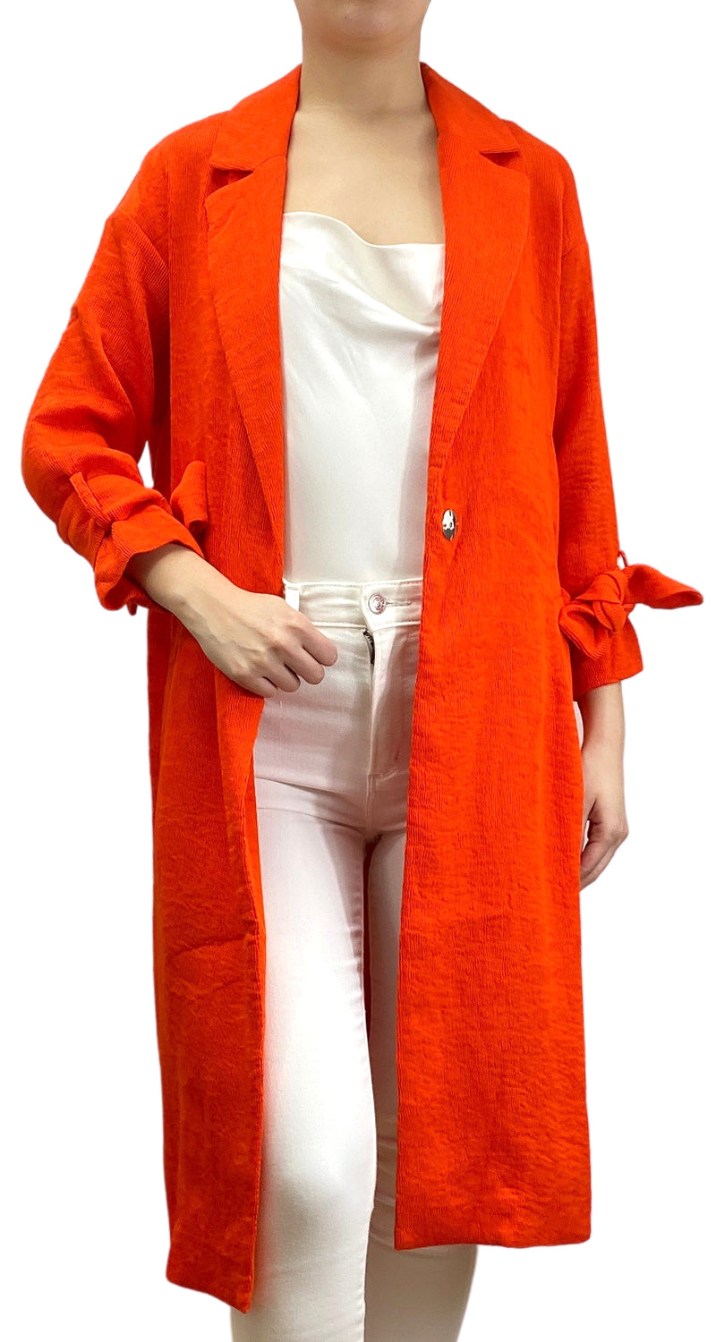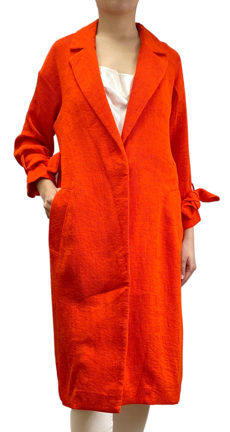 Abrigo color Naranjo con diseño fruncido y broche a presión frontal. Talla 4 US de la marca.