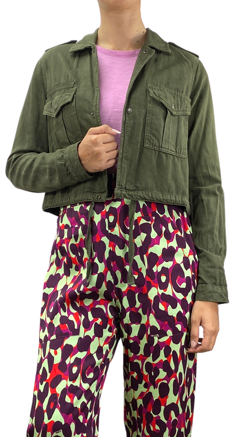 Chaqueta ligera en color Verde Militar, dos bolsillos en delantero, cordón al interior en borde inferior, botones de broches a presión.