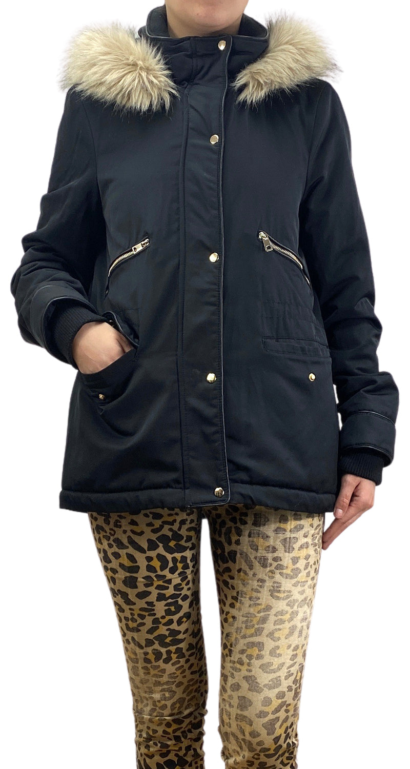 Chaqueta color Negro con cuatro bolsillos en delantero y gorro con piel sintética. Tiene opción de ajuste en cintura. Talla S