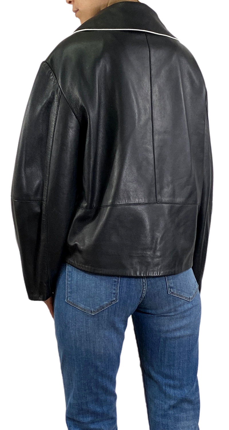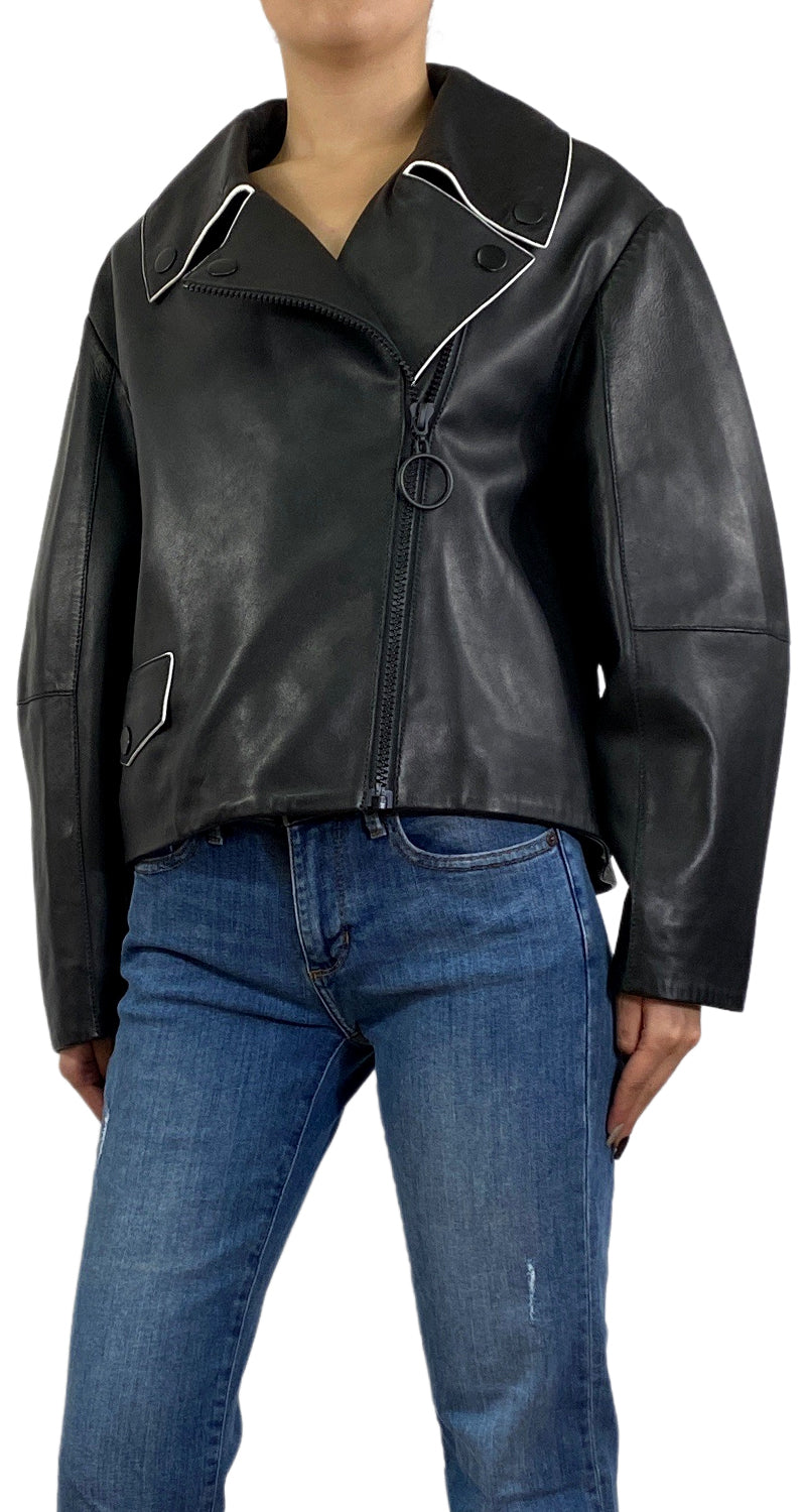 Chaqueta Negra estilo biker con detalle color Blanco en cuello y bolsillo.