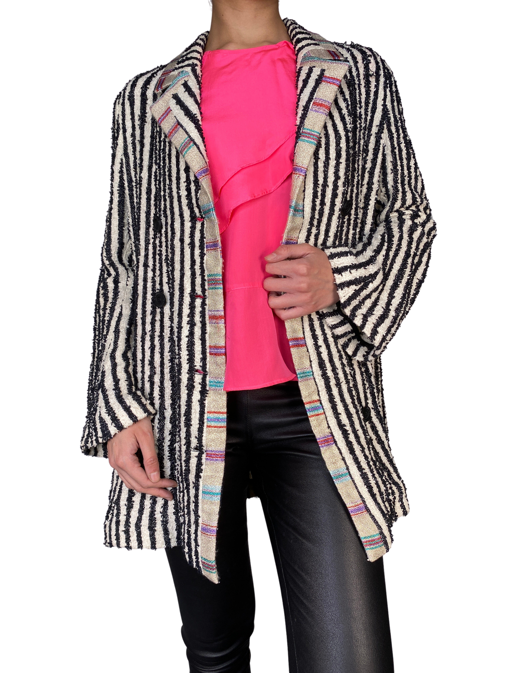 Chaqueta de tweed, oversize con rayas en blanco y negro con detalles metalizados multicolor.