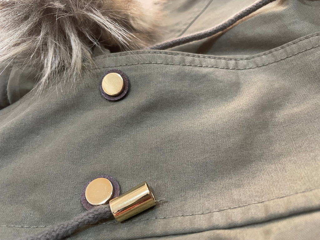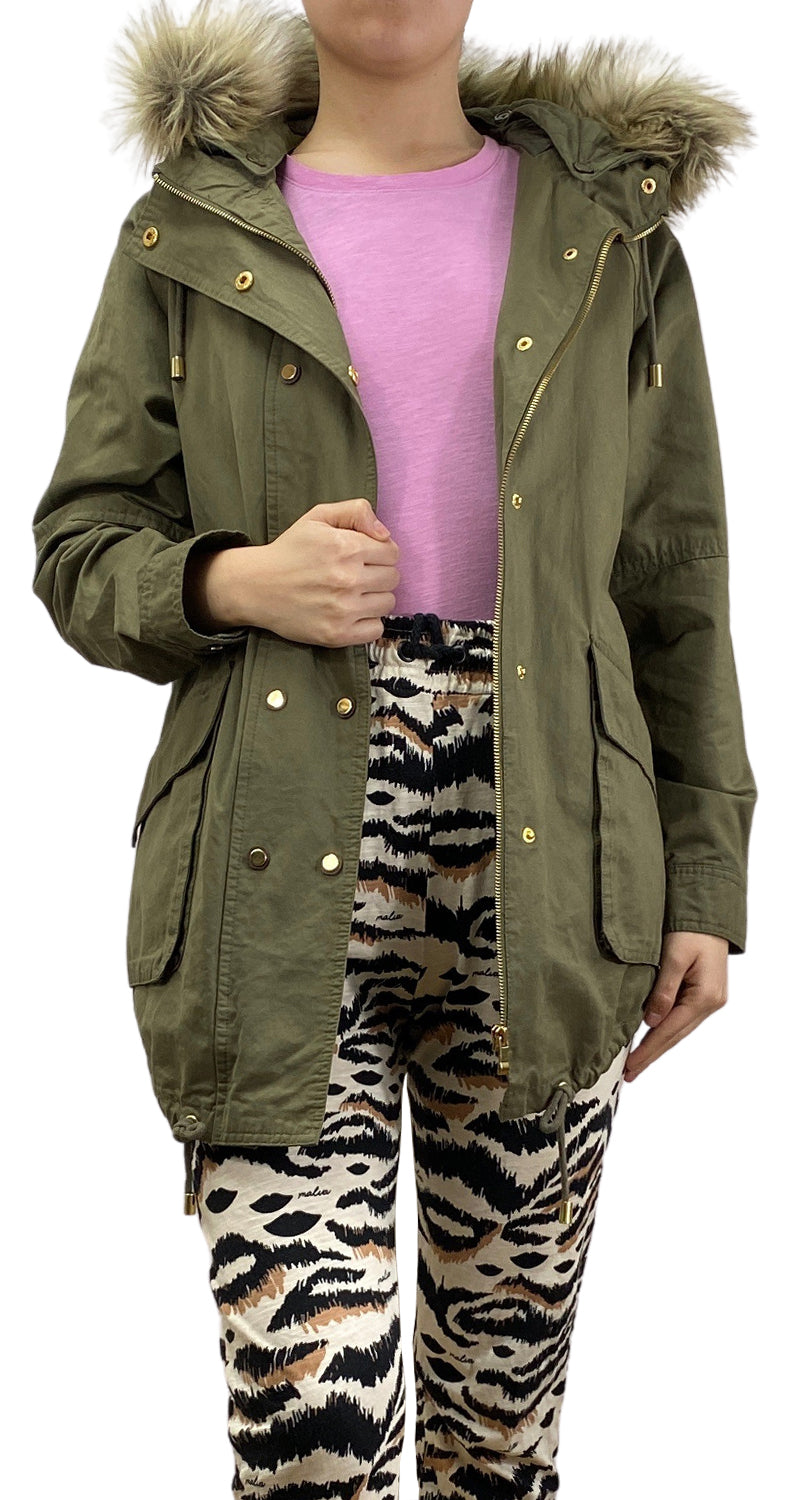 Chaqueta color Verde, capucha desmontable con piel sintética, dos bolsillos frontales, cierre y botones de broches a presión en delantero color Dorado.