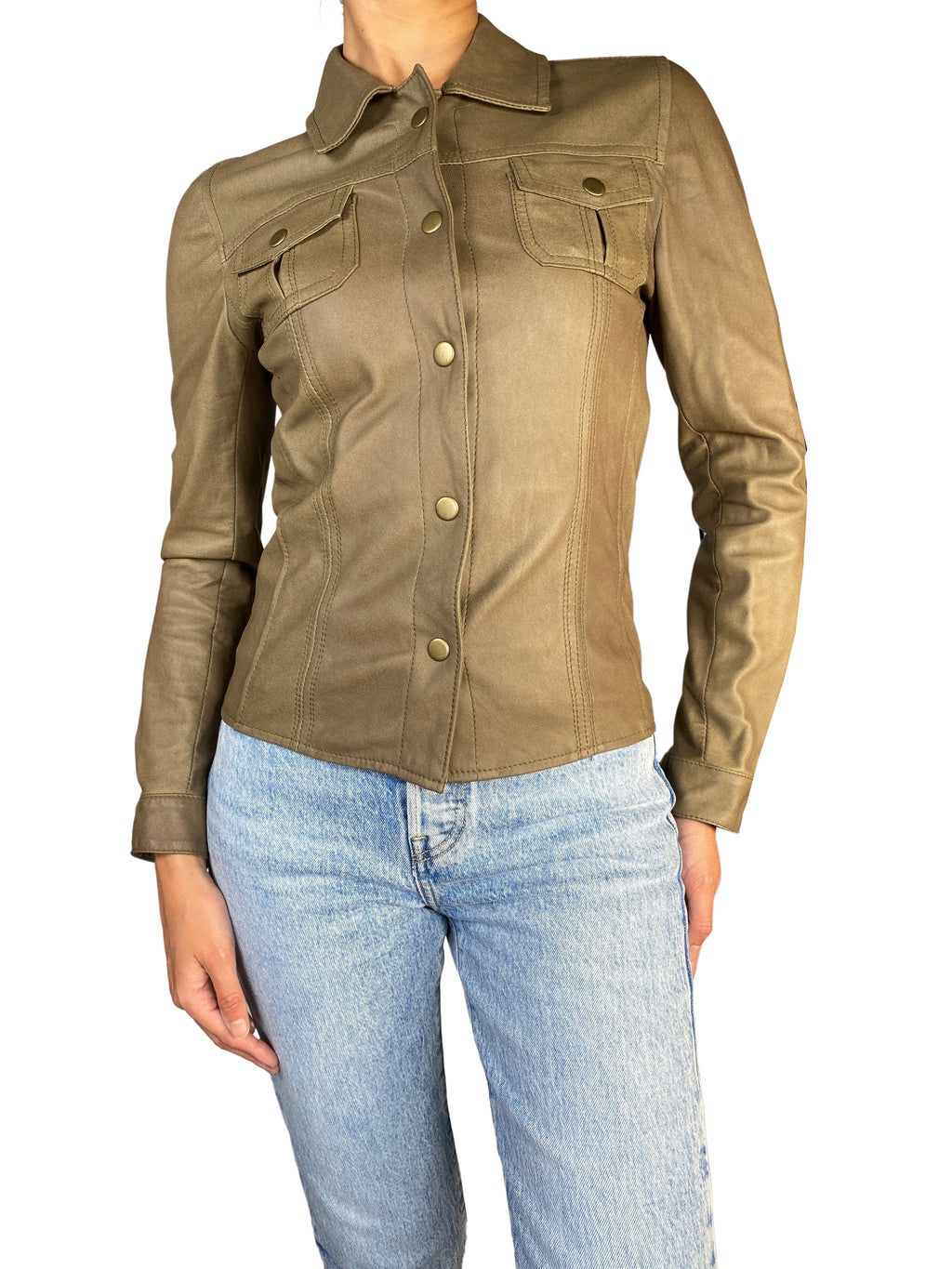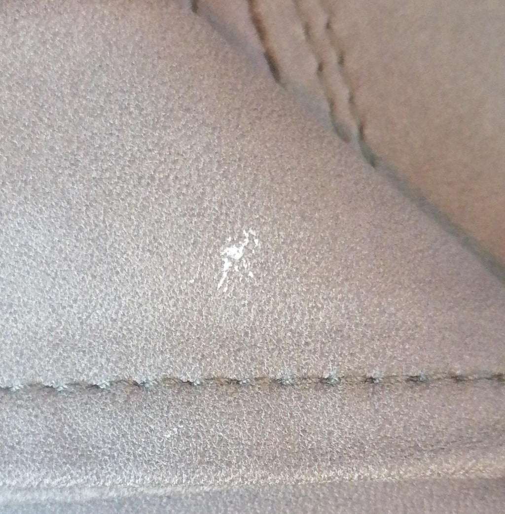 Presenta signo de uso en cuello. Altura de la modelo 1,68. Se siente como cuero.