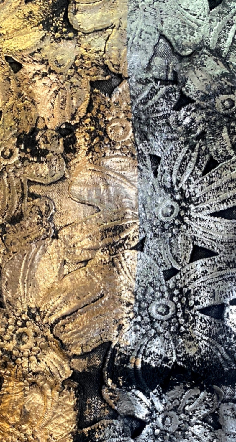 Chaqueta color Negro con encaje de flores pintadas en Dorado y Plateado.