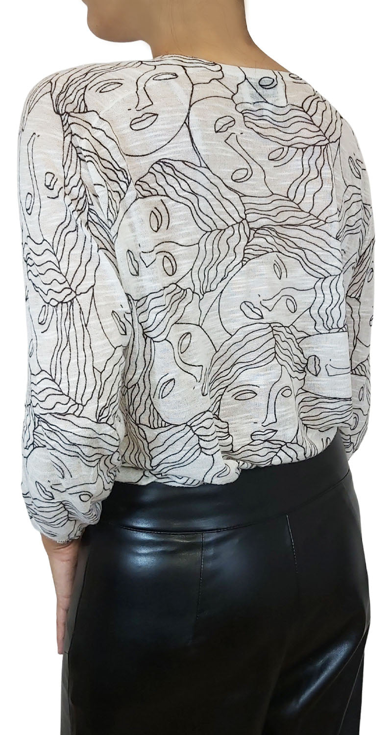 Chaleco delgado manga 3/4 color Blanco con estampado de caras en color Negro y escote en V. Pequeños signos de uso.