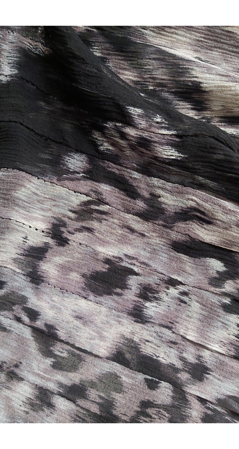 Blusa manga larga semi traslúcida con estampado en tonos Negro y Gris. Con alforzas en espalda. Tiene signos de uso que desaparecen con lavado.