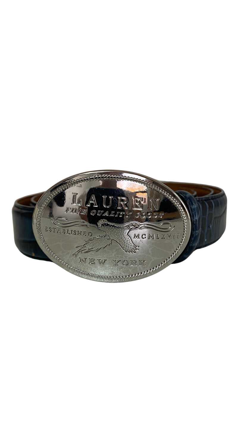 Cinturón color Azul hebilla metalizada y letras propias de la marca. Medidas: 98 cm de largo x 3 cm de anccho.
