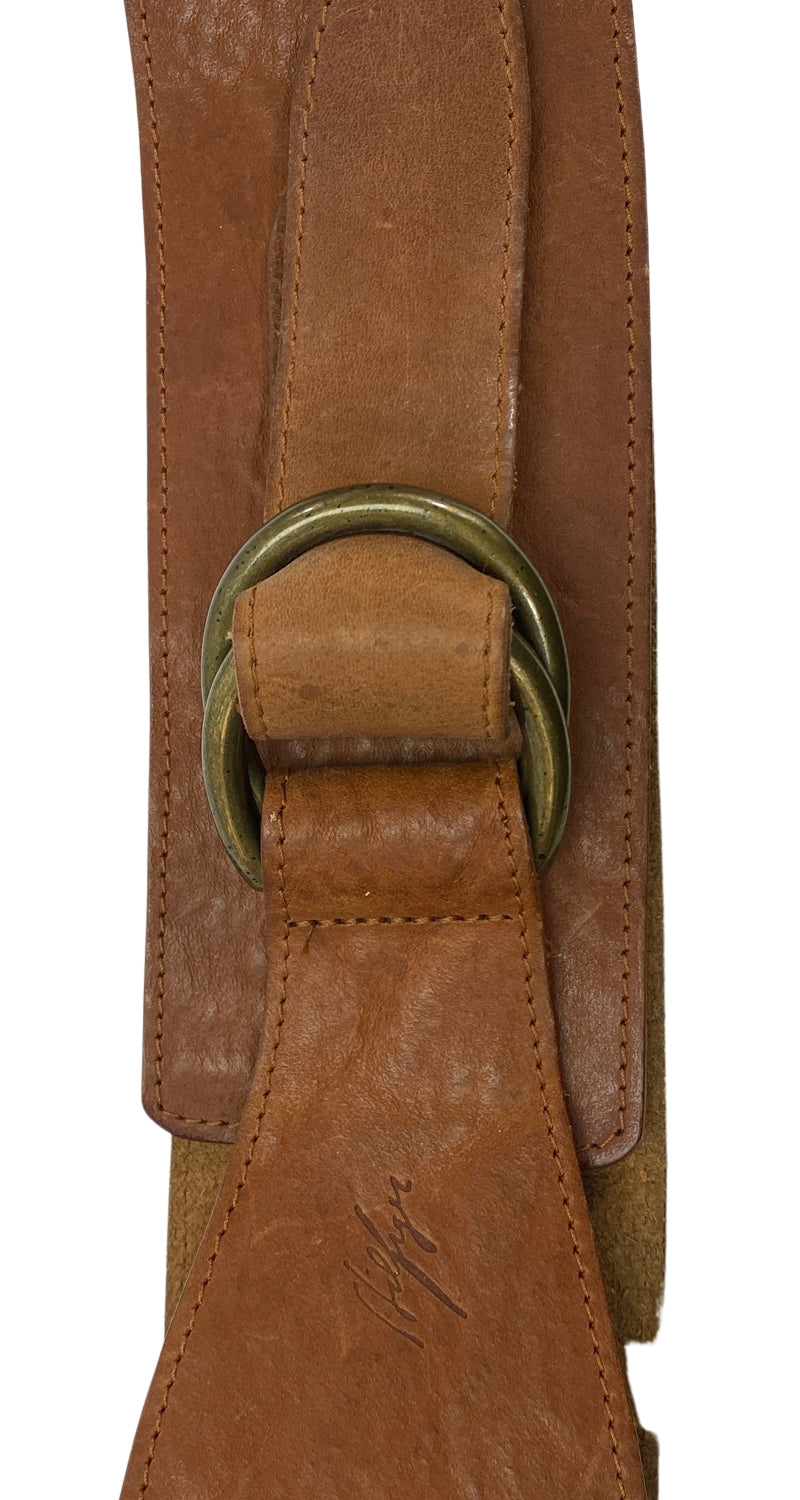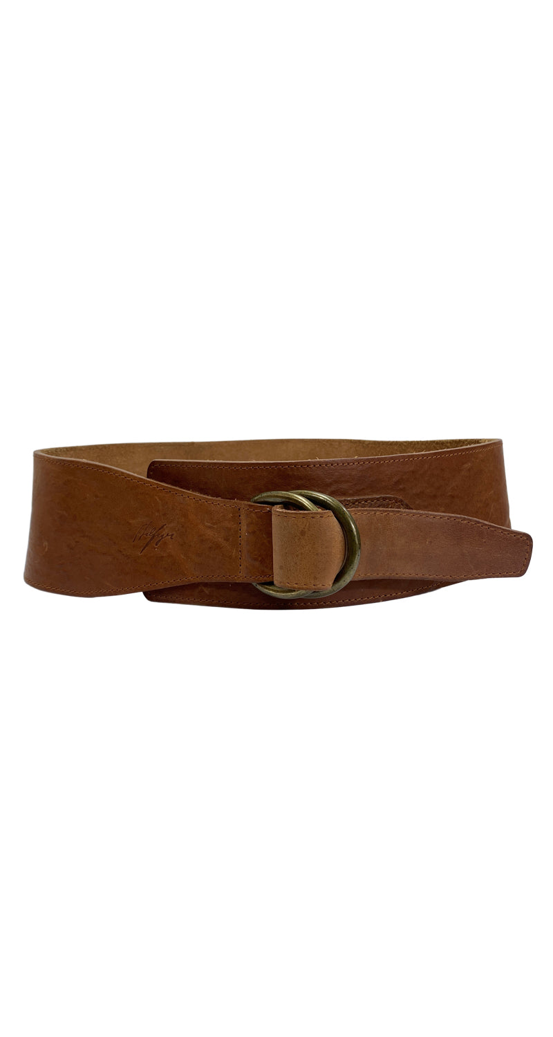 Cinturón color Café con hebillas de argollas en Dorado. Medidas: 8 cm de ancho, 90 cm de largo.