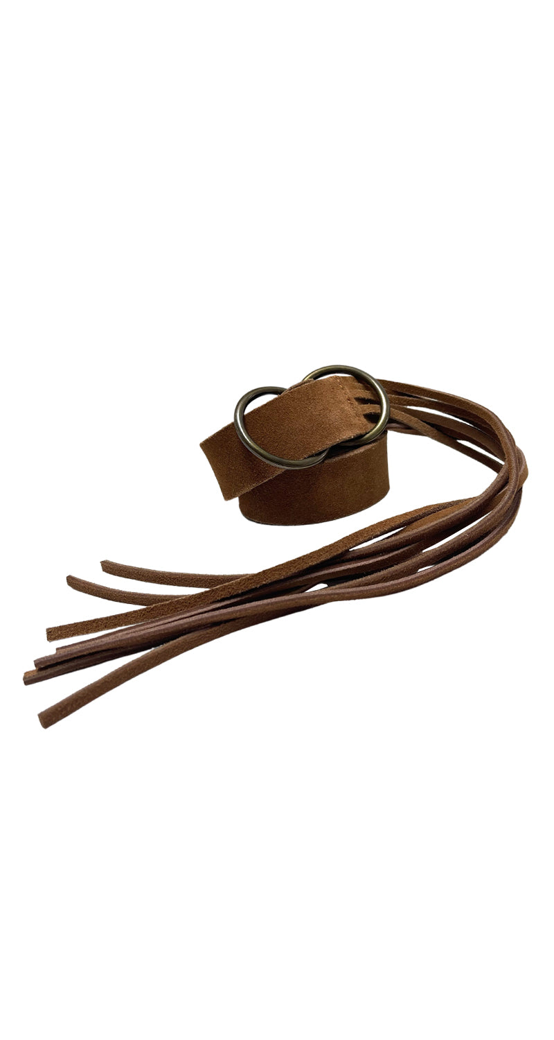 Se siente como cuero. Medidas: 101 cm de largo sin los flecos y 3,5 cm de ancho.