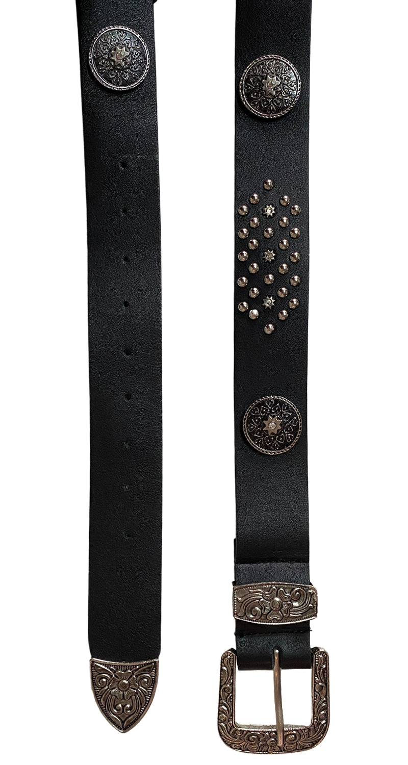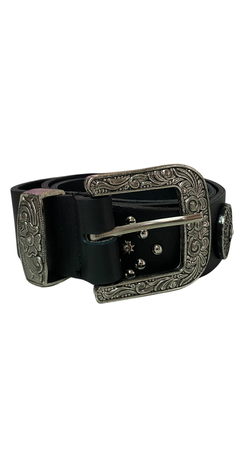 Cinturón color Negro con aplicaciones en Plateado, hebilla con diseño, punta con aplique metalizado. Medidas: lardo de correa 100 cm, hebilla 6 x 6 cm.