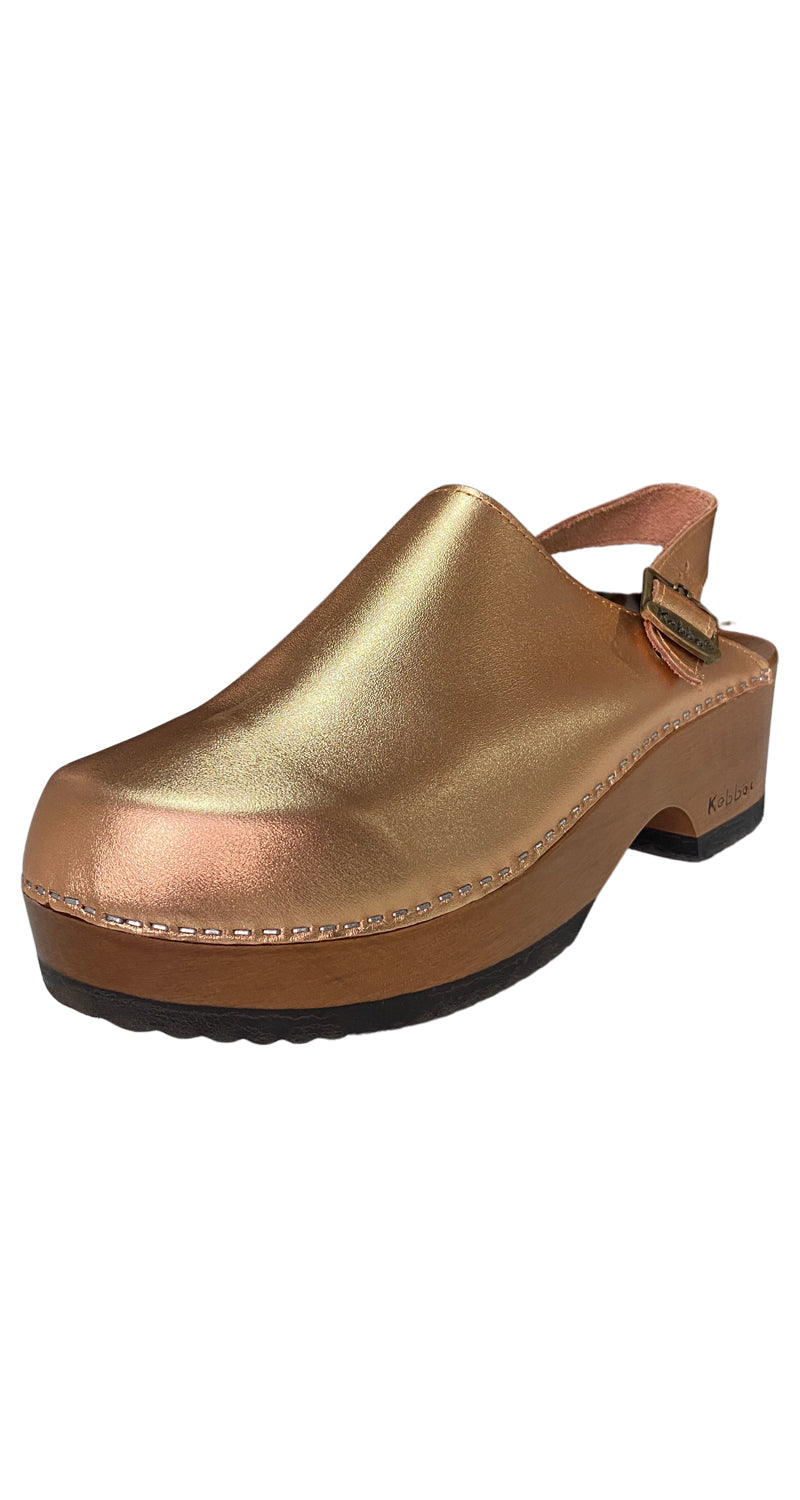 Color metalizado Cobre, capellada cuero 2.2mm al corte sin forro con correa ajustable, planta anatómica Cloc de madera nativa, altura 5 cms. Presenta signos de uso en suela.