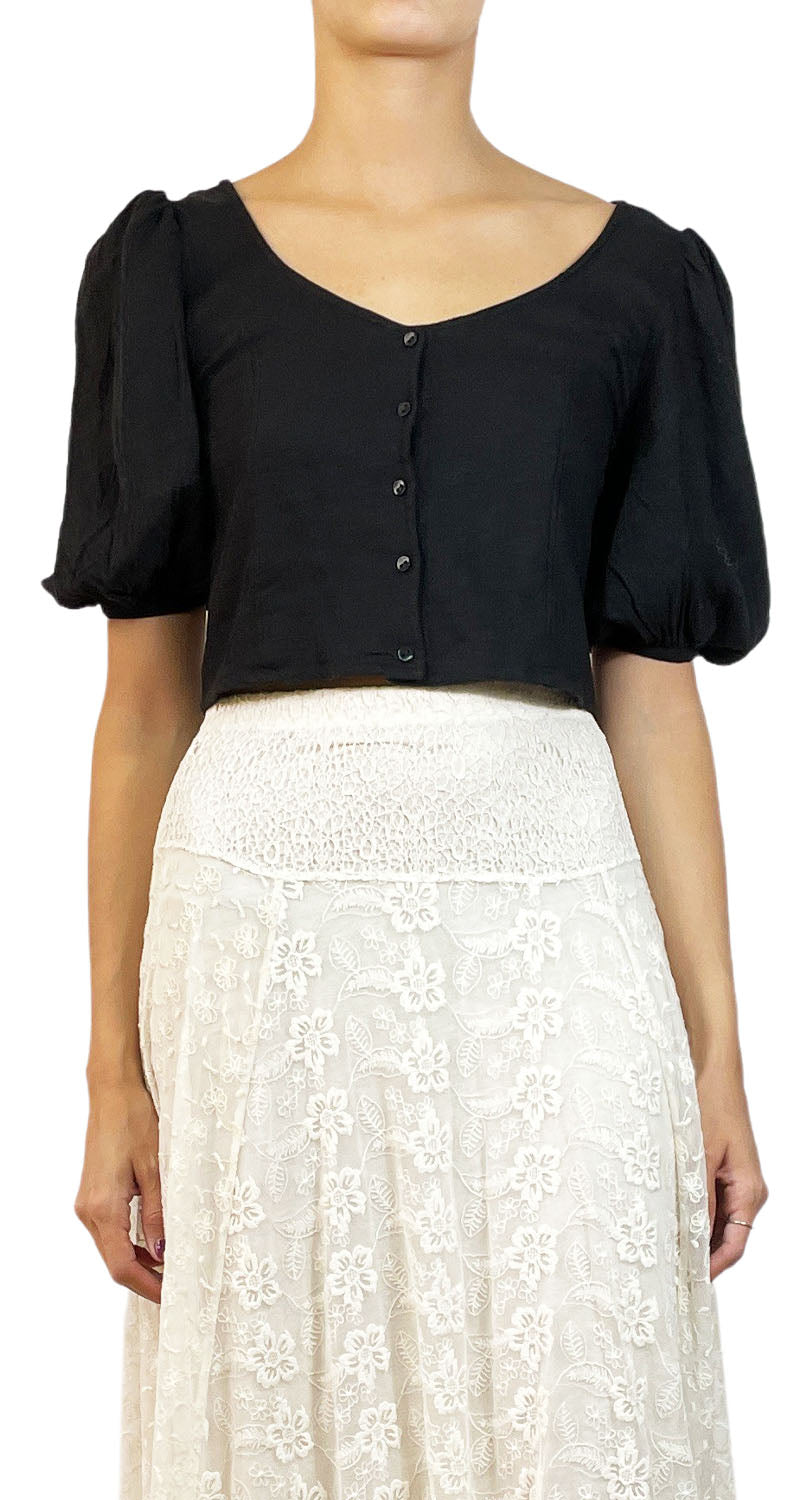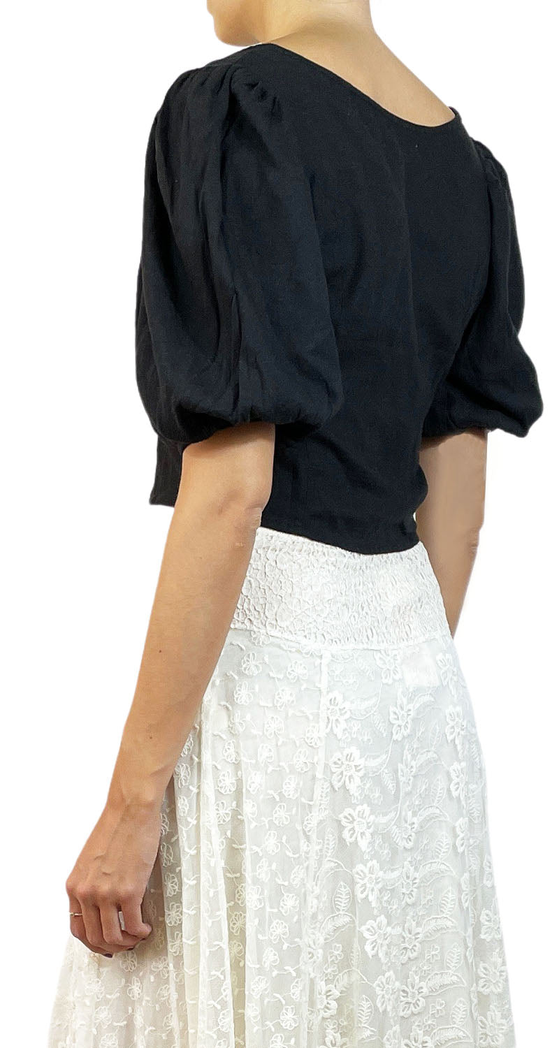 Top color Negro de Lino cuello redondo con mangas bombachas.