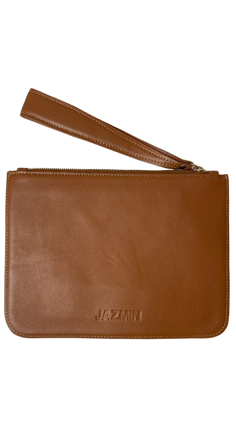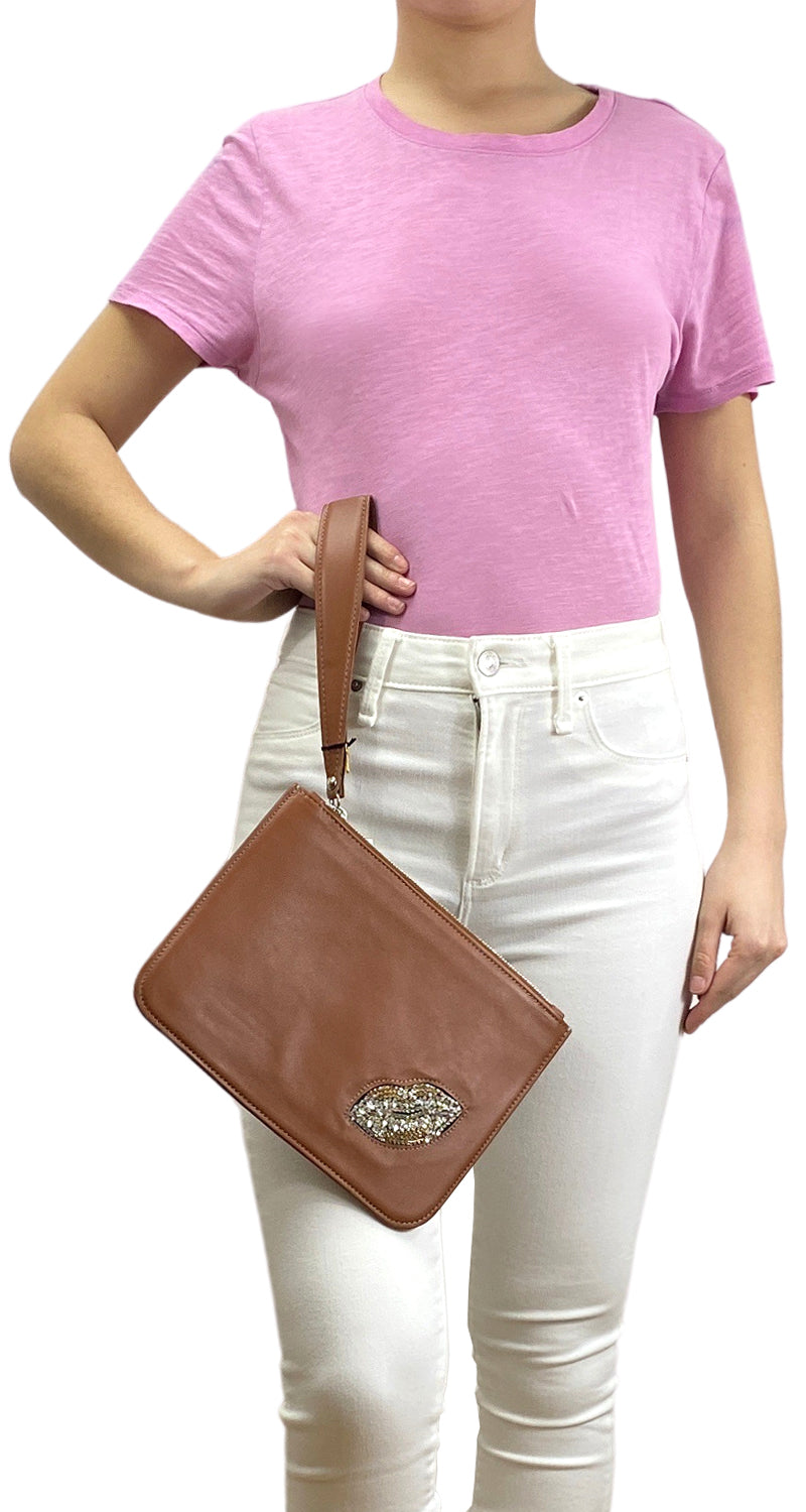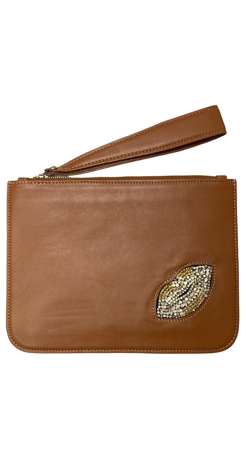 Clutch de cuero color Café con detalle de beso con brillantes en delantero. Medidas: 19 x 26 cm. Viene con dust bag.