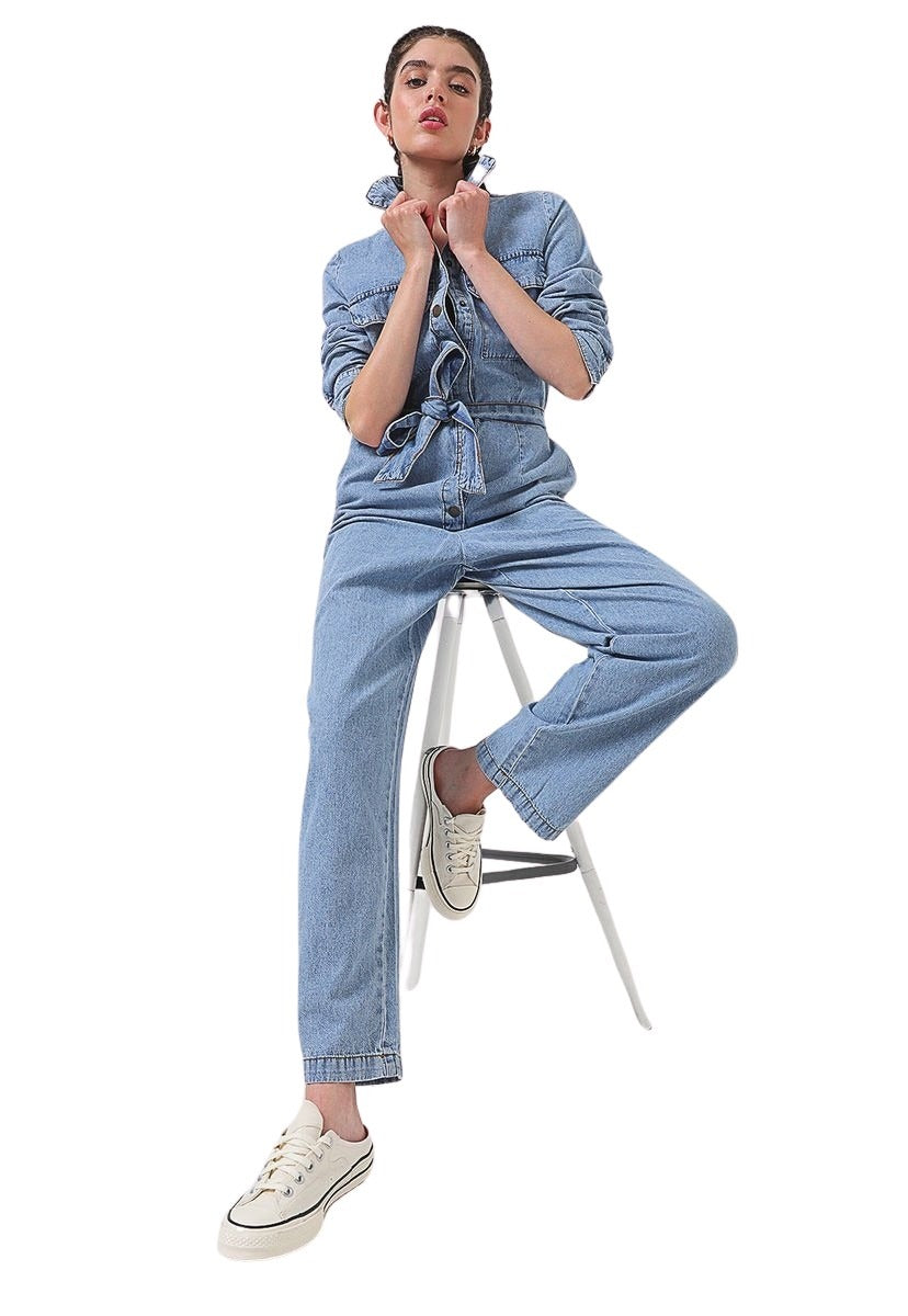 Características: Enterito denim de calce relajado con bolsillos funcionales dos bolsillos con solapa y lazo de ajuste a la altura de la cintura