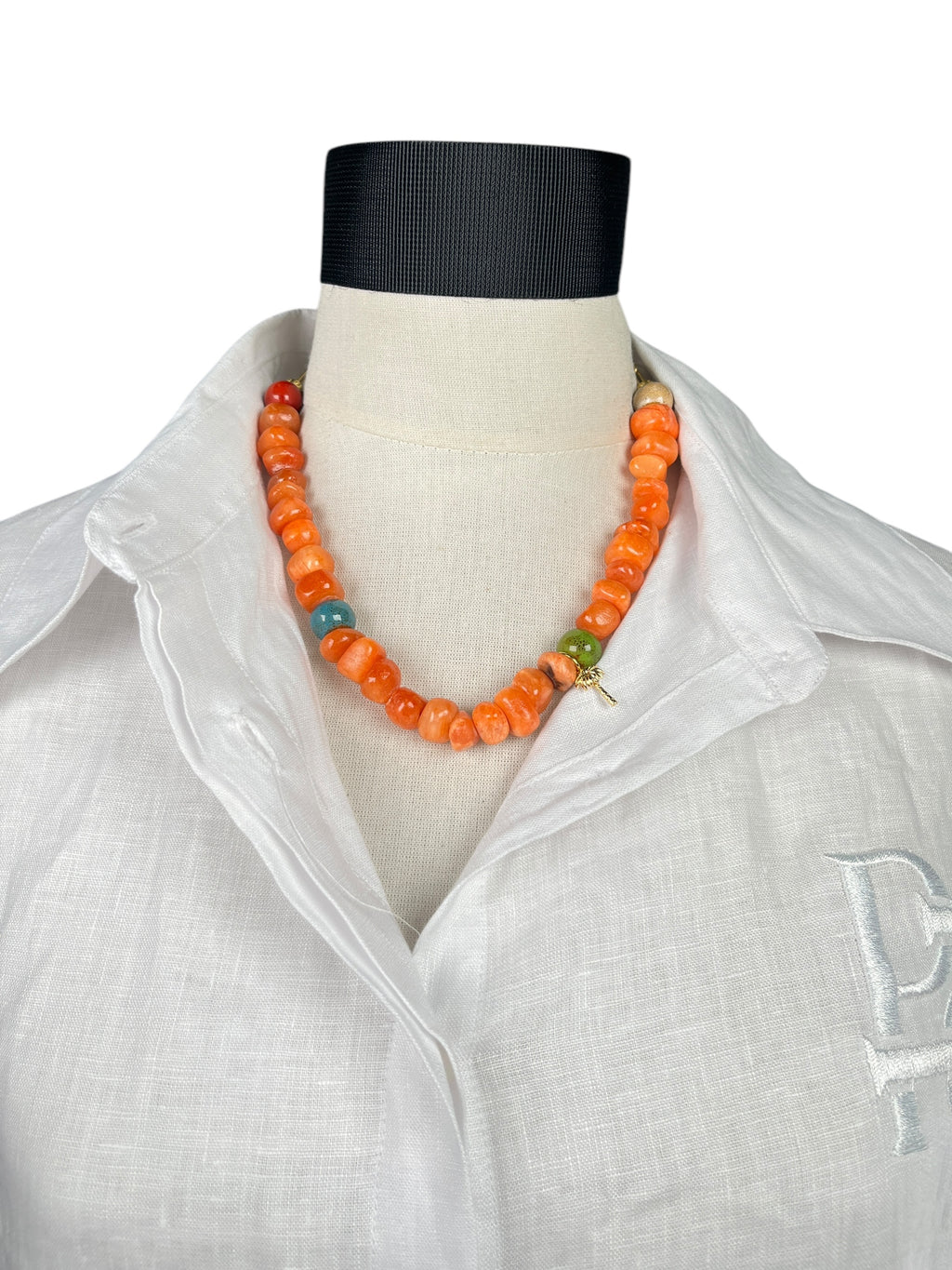 collar de piedras naranjas ( ágata ) con una pequeña palmerita colgando, lleva cadena atrás para darle distintos largos, largo aprox 45 a 50 cm.