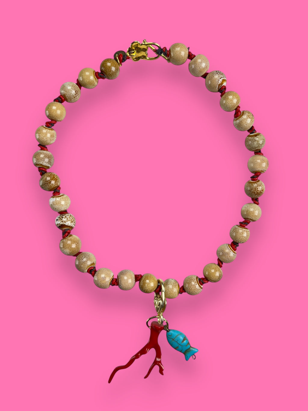collar cuentas de cerámica hechas a mano, hiladas con hilo y cuero cuentas de 10 mm aprox. Con colgante. Largo collar 46 cm.