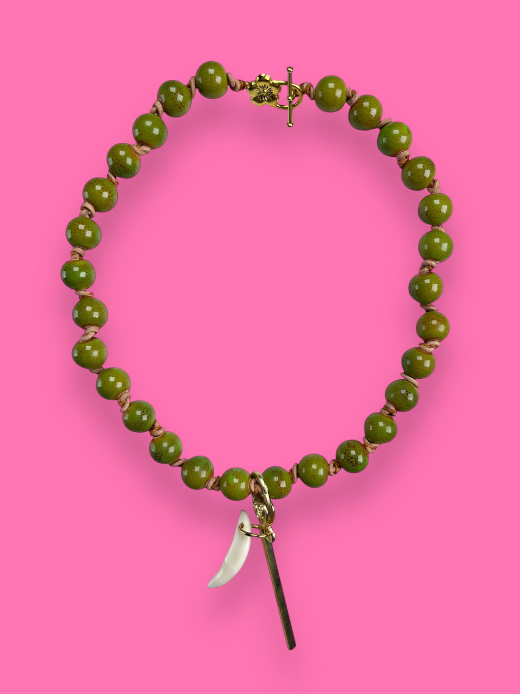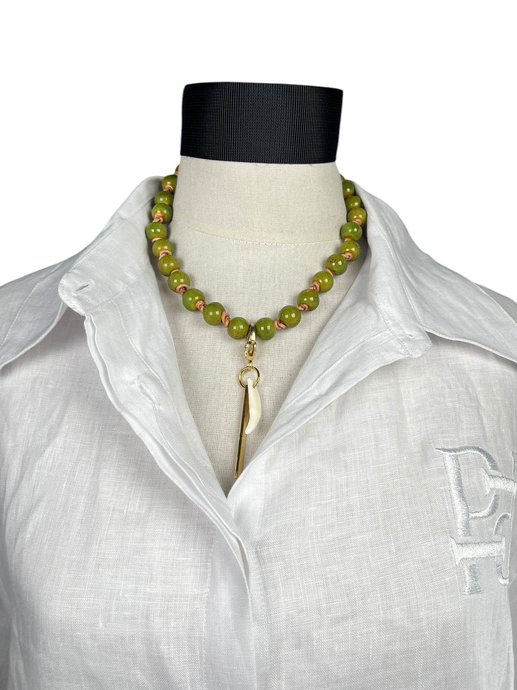 Collar cuentas de cerámica hechas a mano, hiladas con hilo y cuero cuentas de 10 mm aprox. Con colgante. Largo collar 46 cm.