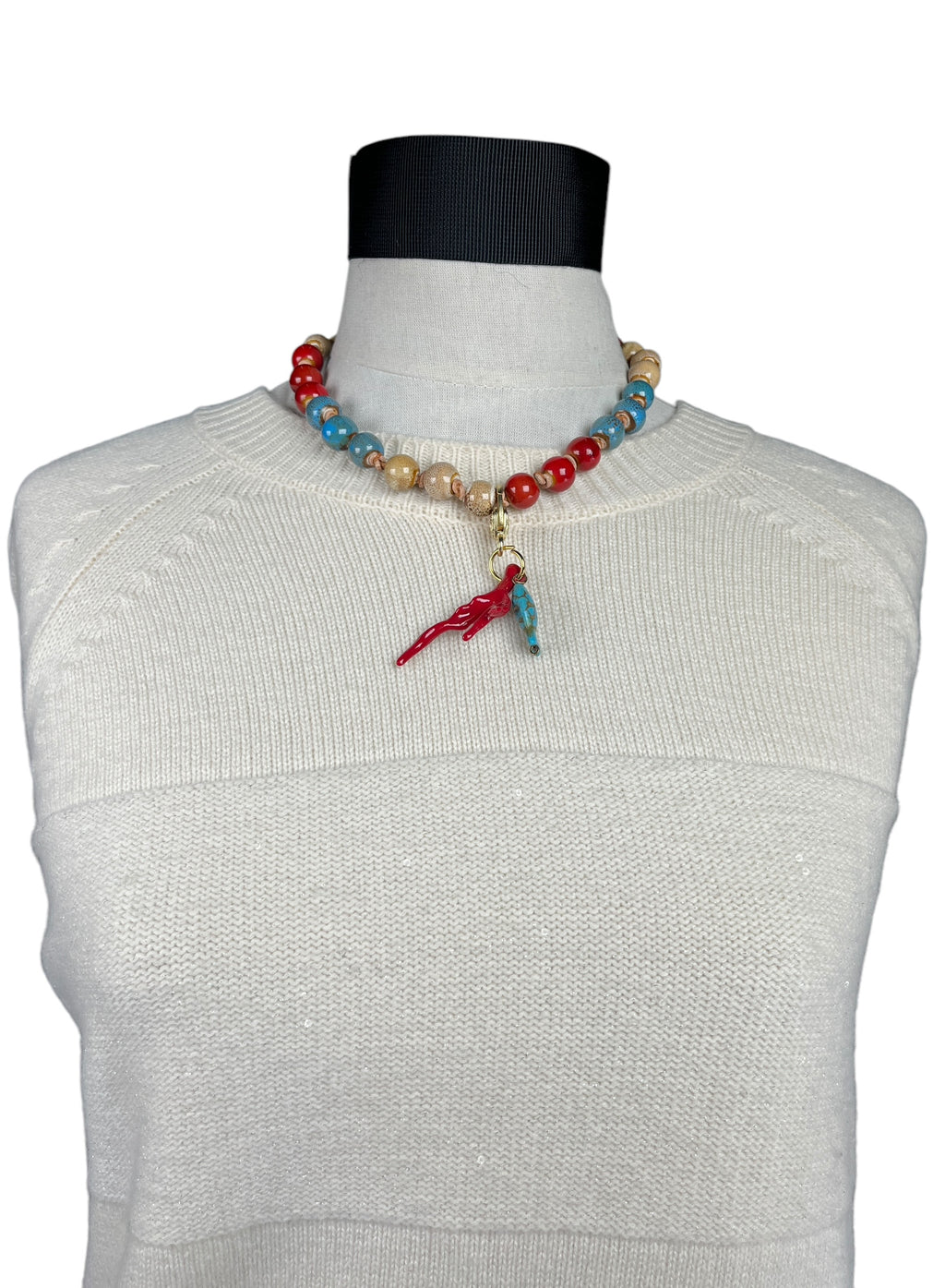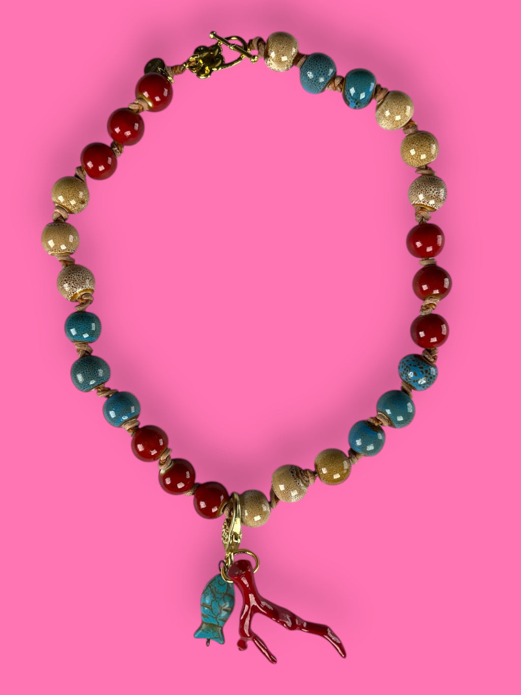 Collar cuentas de cerámica hechas a mano, hiladas con hilo y cuero. Cuentas de 10 mm aprox. Largo collar 46 cm.