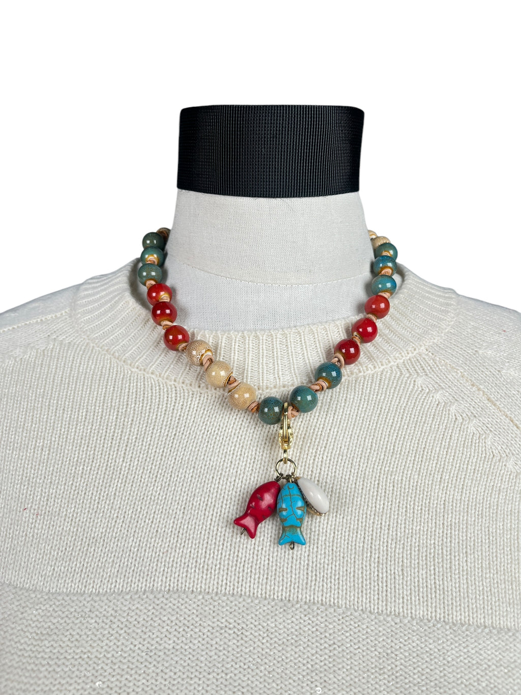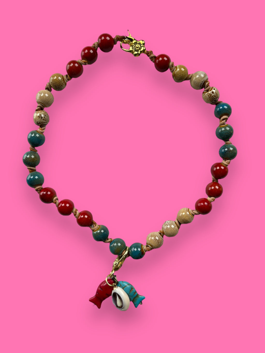 Collar cuentas de cerámica hechas a mano, hiladas con hilo y cuero. Cuentas de 10 mm aprox. Largo collar 46 cm.