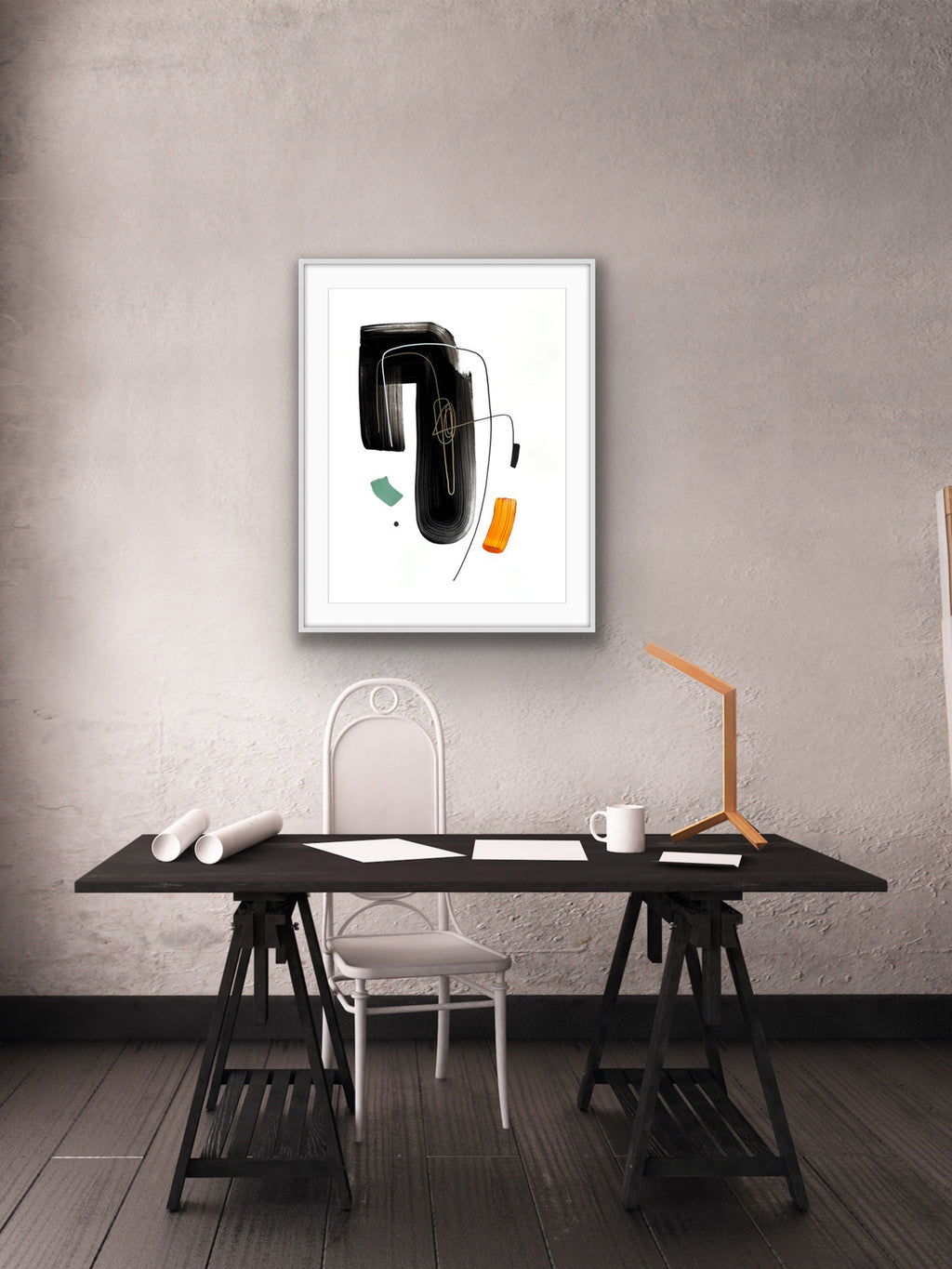 Acrílico sobre papel 73,4 x 93,4 cm (Medida obra con marco) 2022 (Obra enmarcada con paspartú blanco y moldura plata acero imitación aluminio)