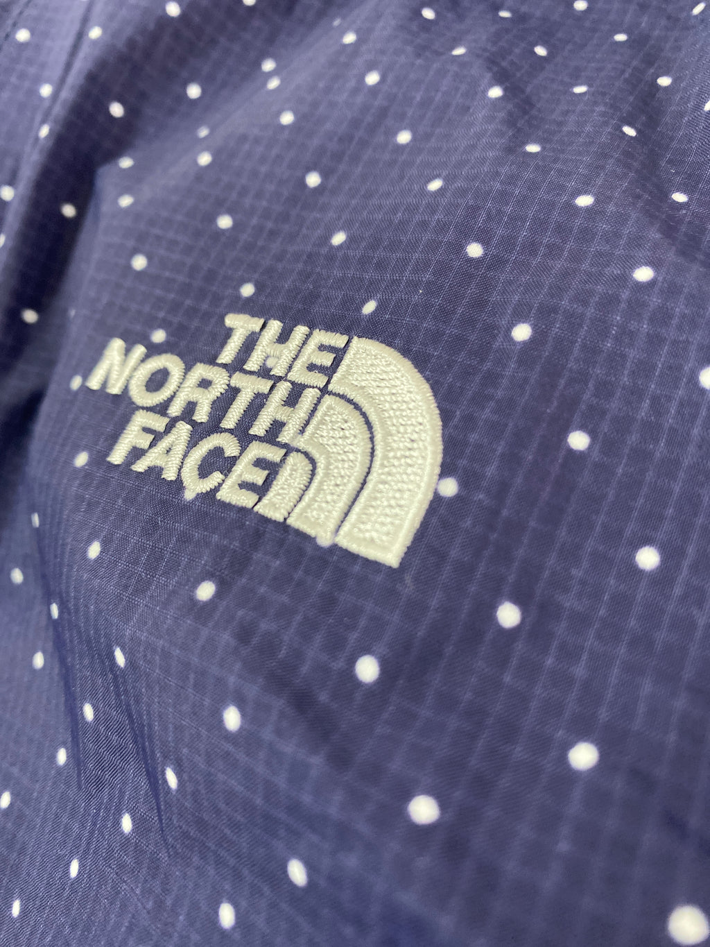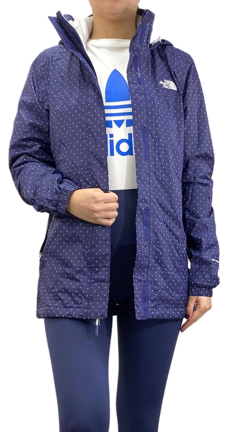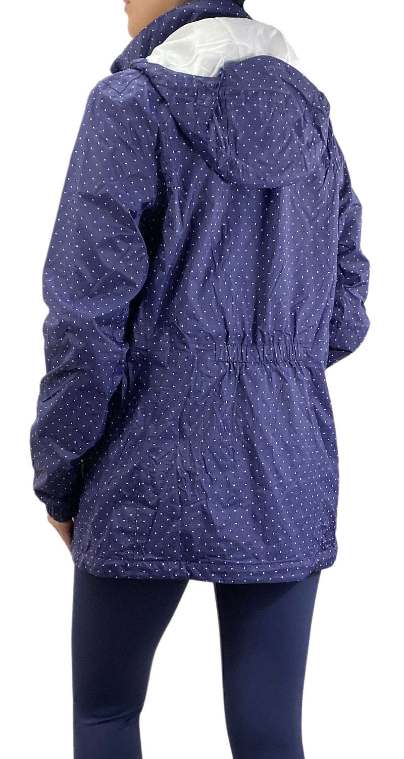Cortavientos color Azul con estampado de lunares y bordado frontal en hilos blancos.