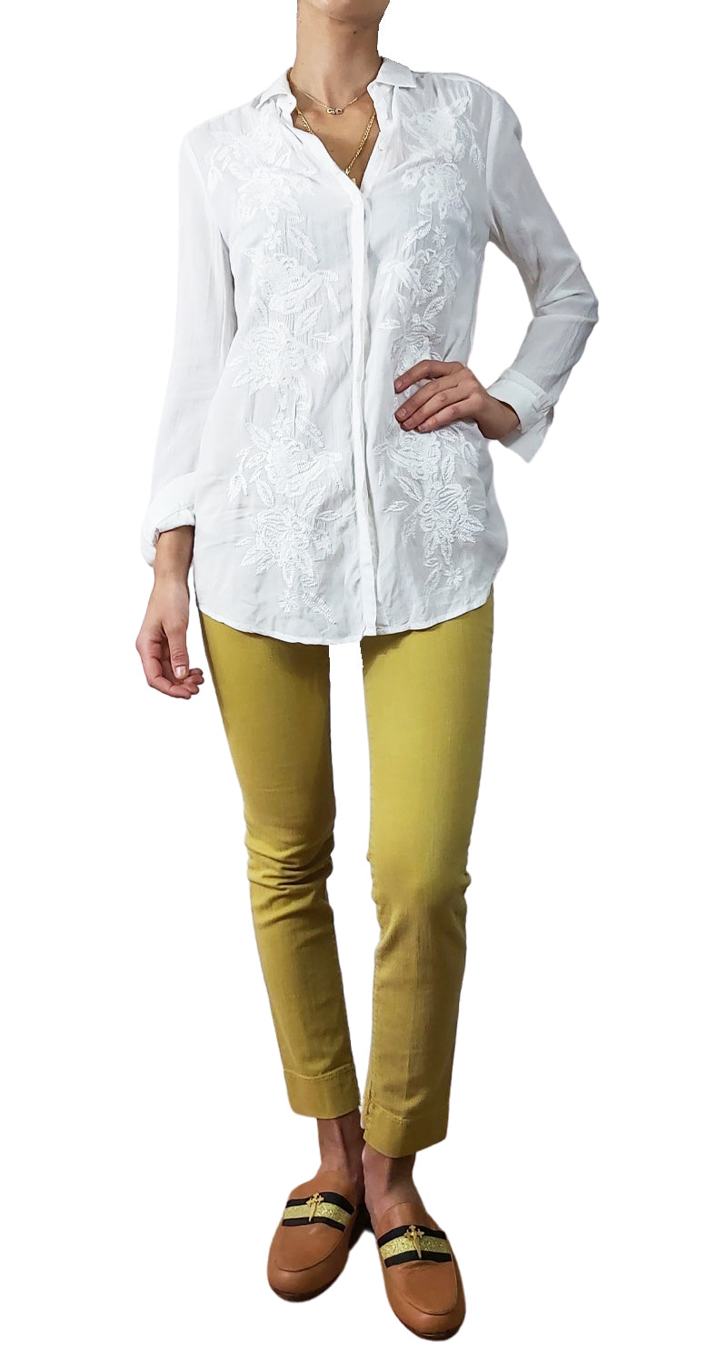 Blusa Blanca con botones en delantero y bordado de flores. Leves signos de uso que desaparecen con lavado.